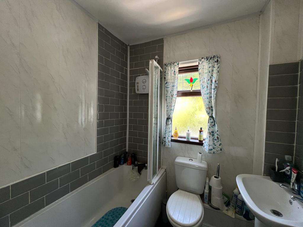 Comprising bath with part tiling around and electric shower over, shower screen, whb and wc, tiled floor.