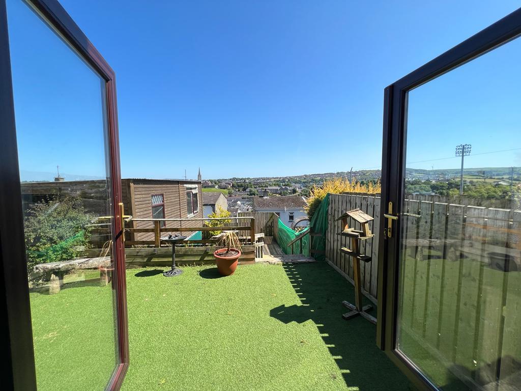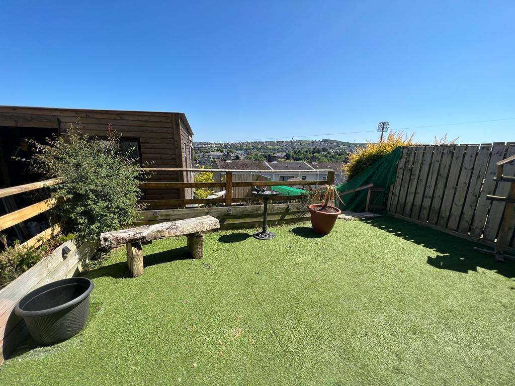 Lawn to rear laid in artificial grass to leading to patio area.