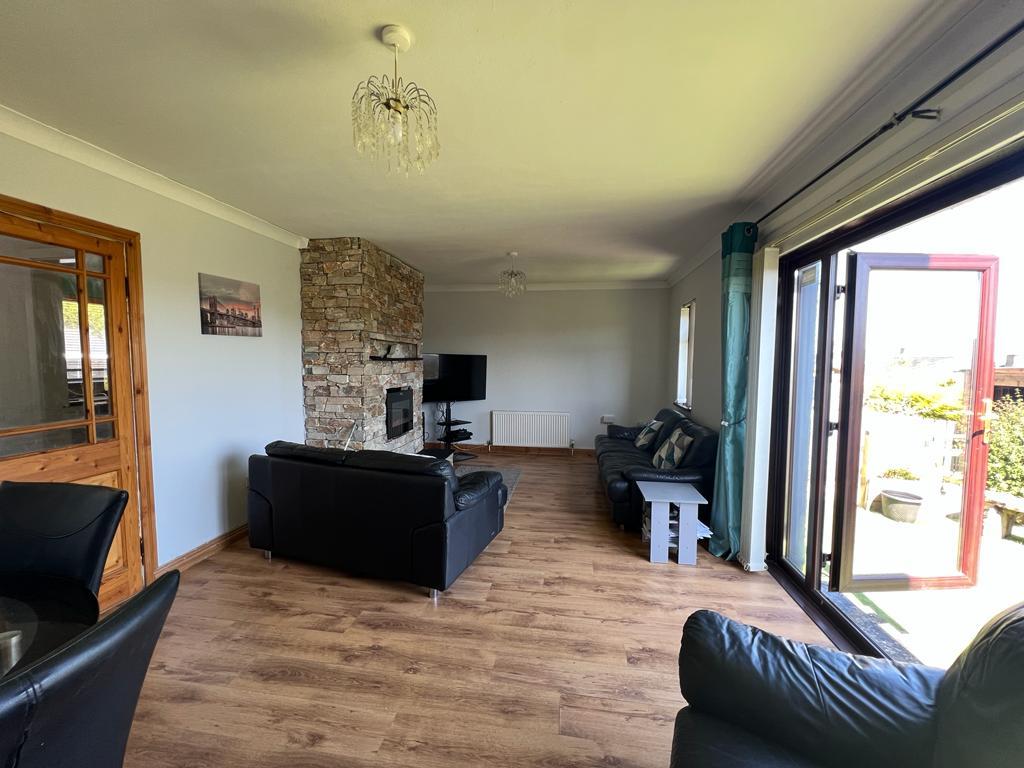 Having attractive ornamental stone fireplace with electric inset, ceiling cornicing, laminated wooden floor, French doors.