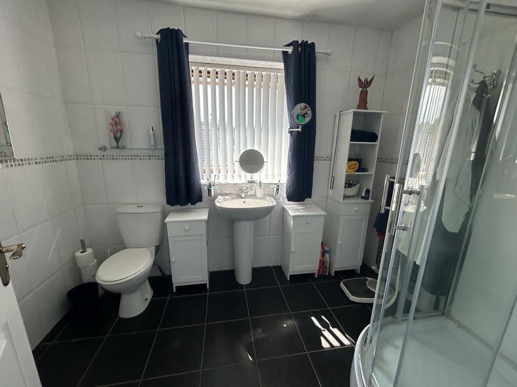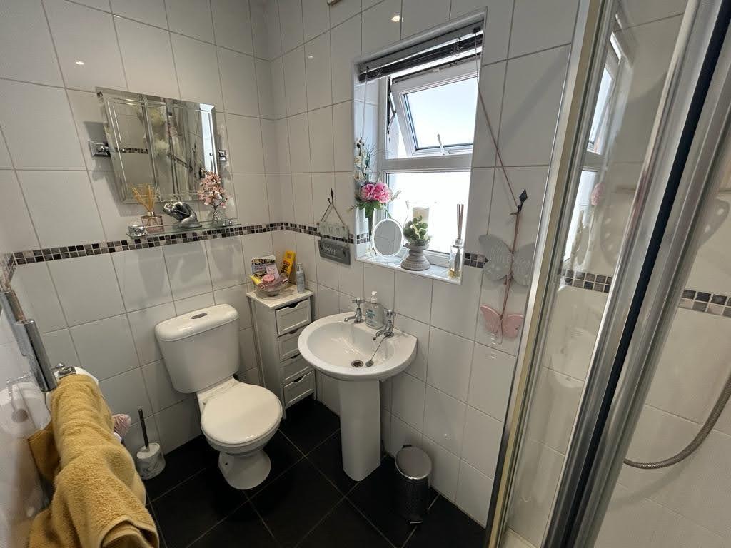 Comprising fully tiled walk in electric shower, whb and wc, recessed lighting, heated towel rail, fully tiled walls, tiled floor.