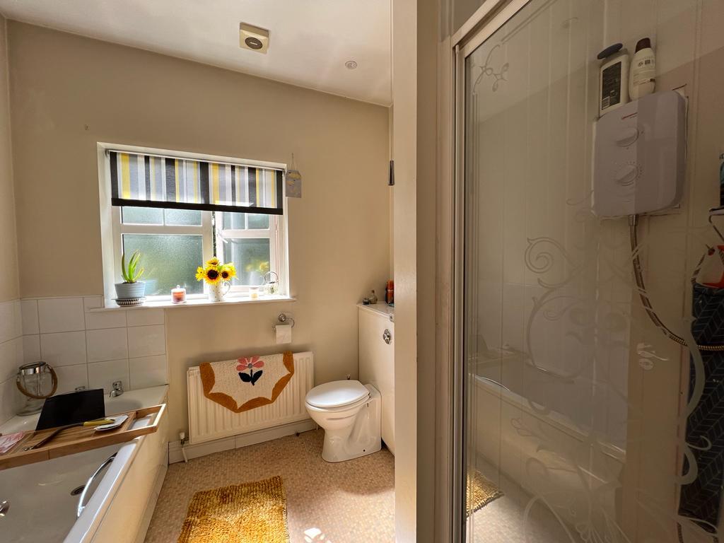 Comprising bath, whb and wc, walk in shower with PVC cladding to walls.