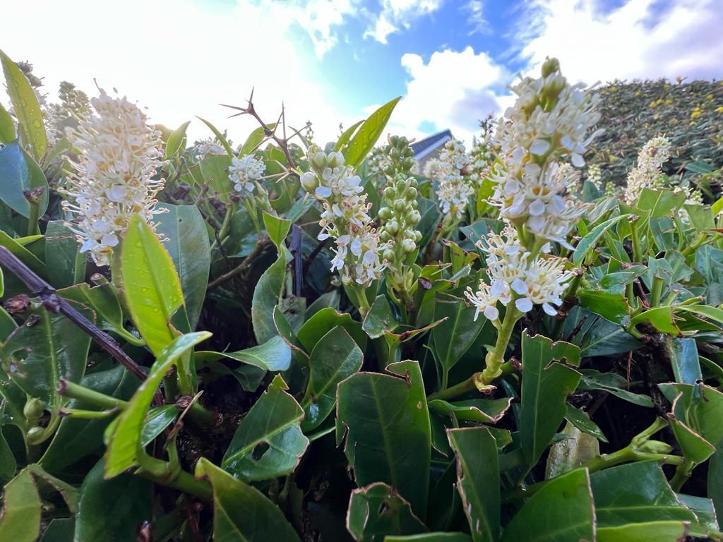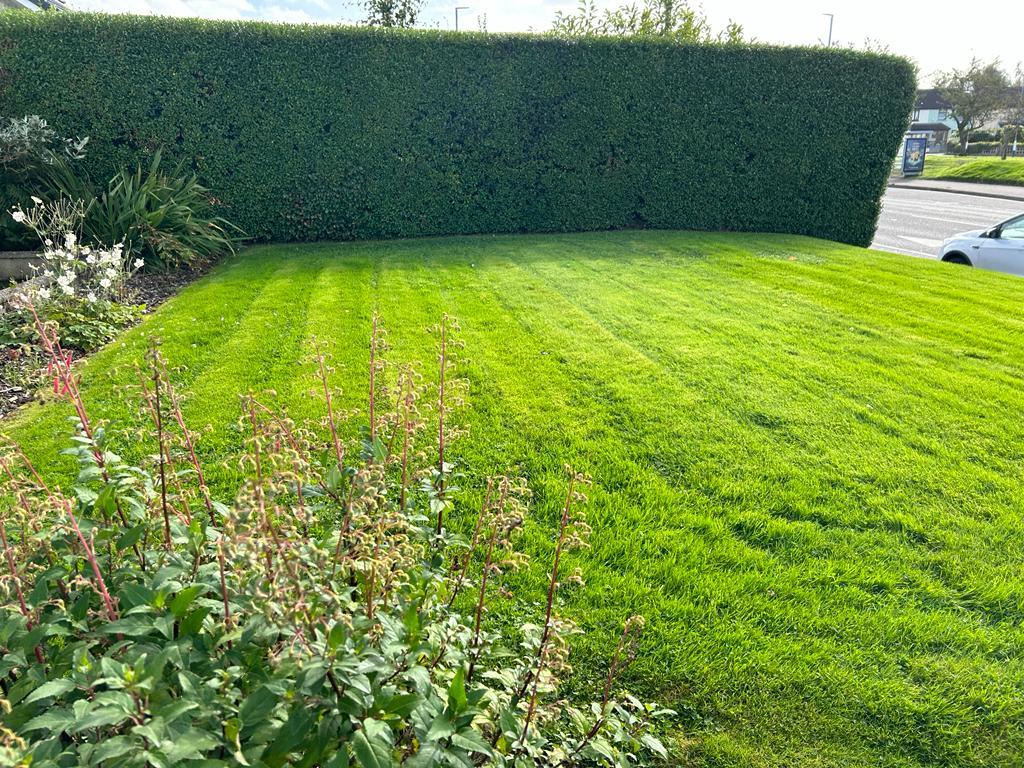 Neatly manicured lawns to front and rear stocked with abundance of mature plants, trees and shrubs.