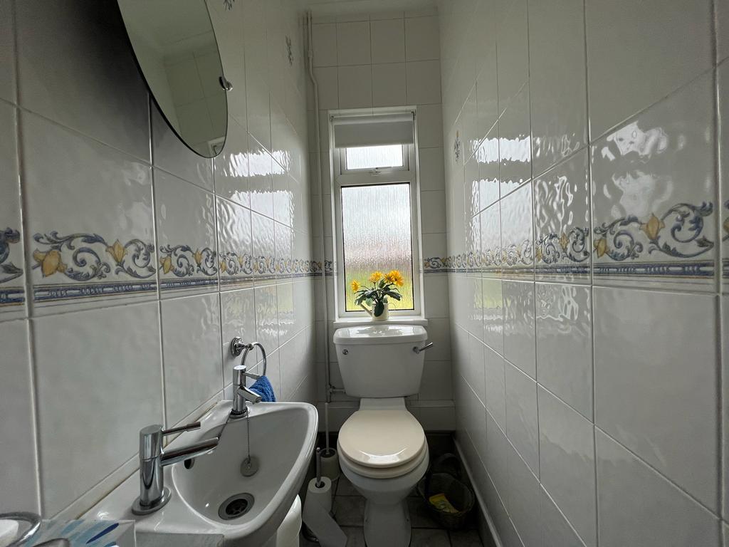 Comprising walk in electric shower, whb set in vanity unit, wc, chrome radiator, fully tiled walls, tiled floor.