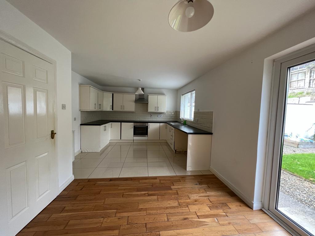 Having eye and low level units, tiling between units, 1 1/2 bowl stainless steel sink unit with mixer taps, integrated hob and underoven, stainless steel extractor fan, space for fridge / freezer, plumbed for washing machine, space for tumble dryer, tiled floor, French doors, wooden floor in dining area.