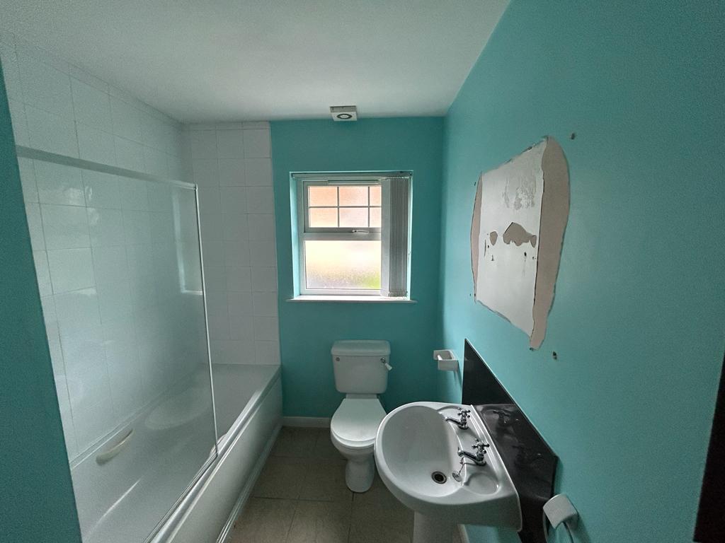 Comprising bath with electric shower over and tiling around, whb with tiling around, wc, extractor fan, hotpress, tiled floor.