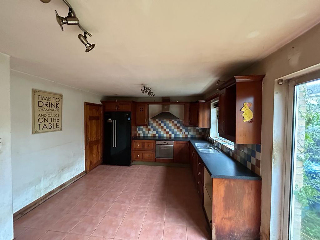 Having eye and low level units, tiling between units, 1 1/2 bowl single drainer stainless steel sink unit with mixer taps, integrated hob and underoven, stainless steel extractor hood, space for American style fridge / freezer, understairs storage, storage cupboard, tiled floor.