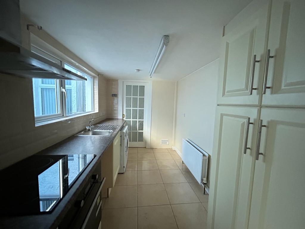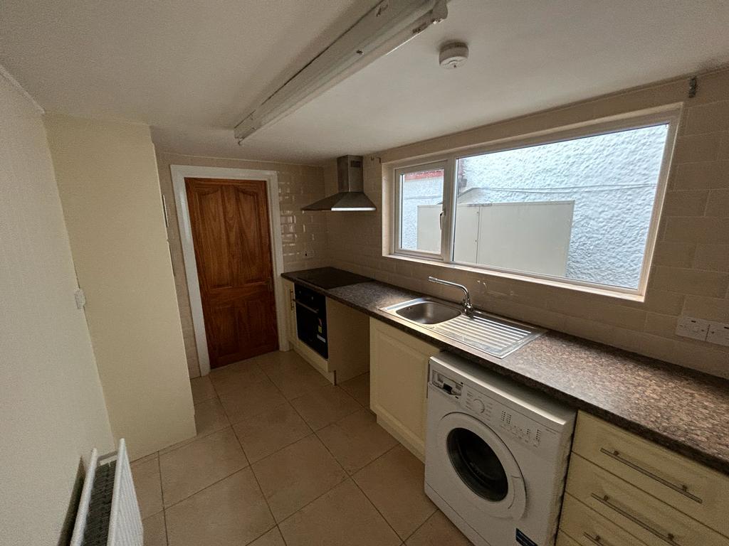 Having low level units, tiling between units, stainless steel sink unit with mixer taps, integrated hob and underoven, stainless steel extractor hood, plumbed for washing machine, vented for tumble dryer, tiled floor.