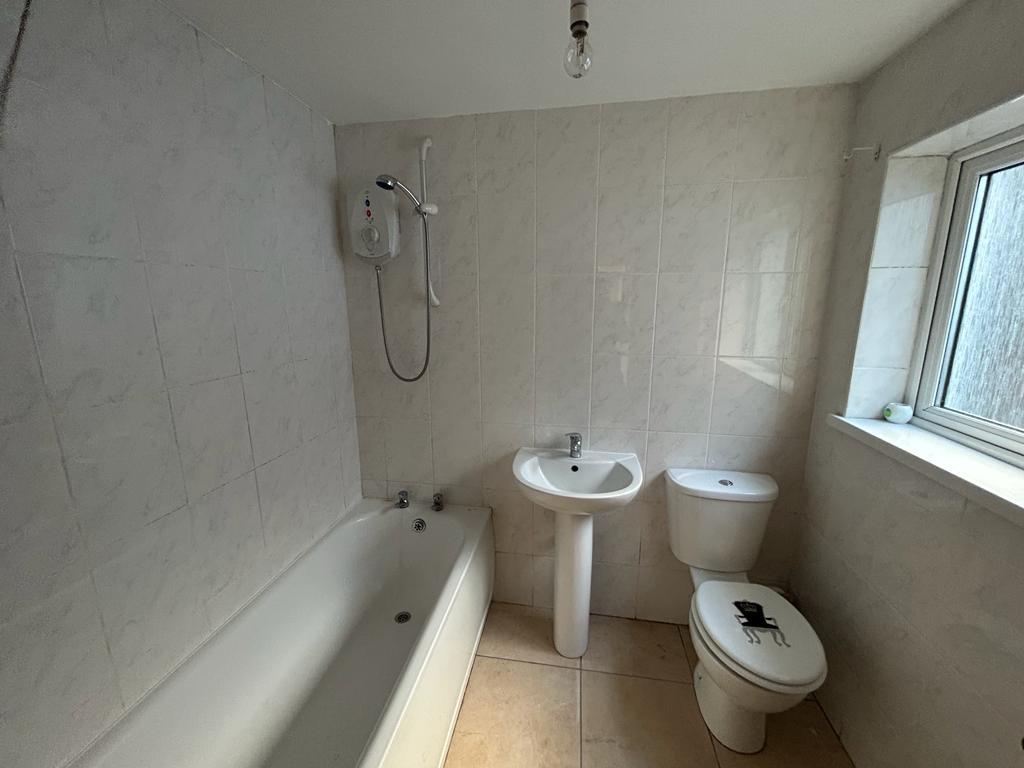 Comprising bath with electric shower over, whb and wc, extractor fan, fully tiled walls, tiled floor.