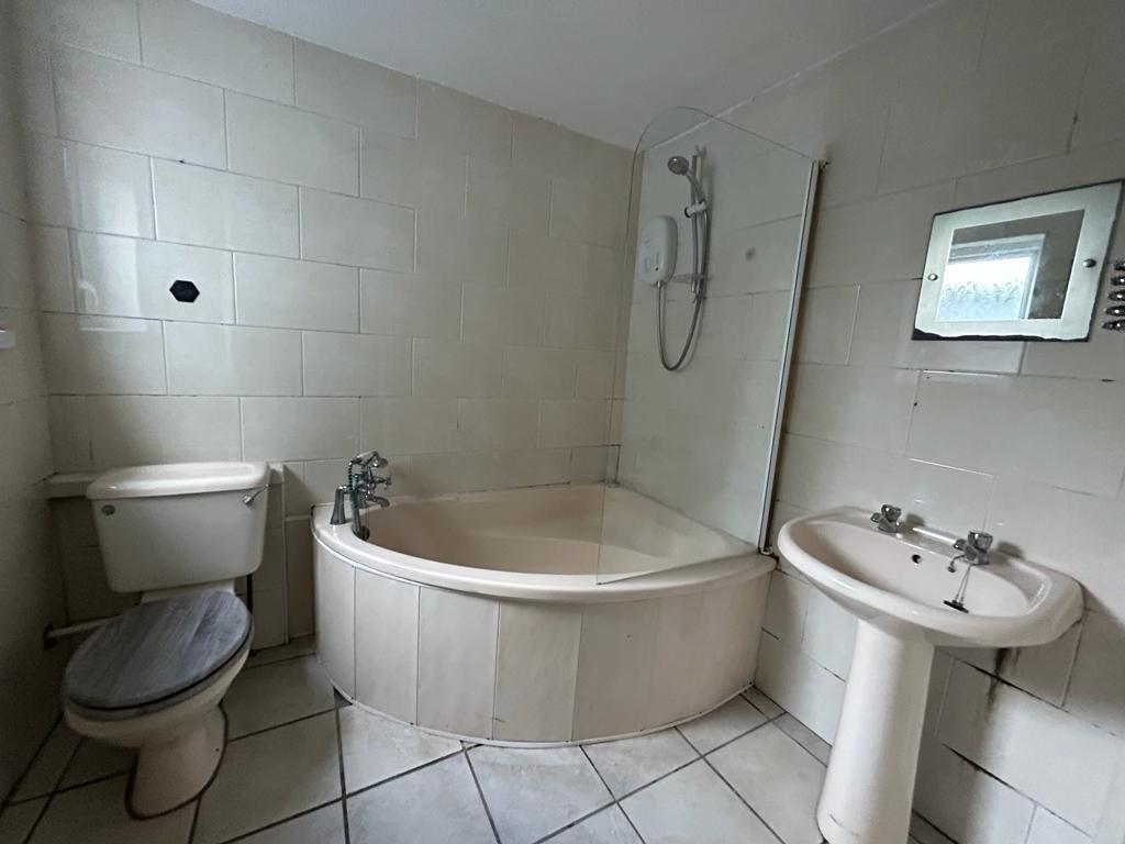 Comprising corner bath with telephone hand shower attachment to taps and electric shower over, whb and wc, extractor fan, fully tiled walls and floor.