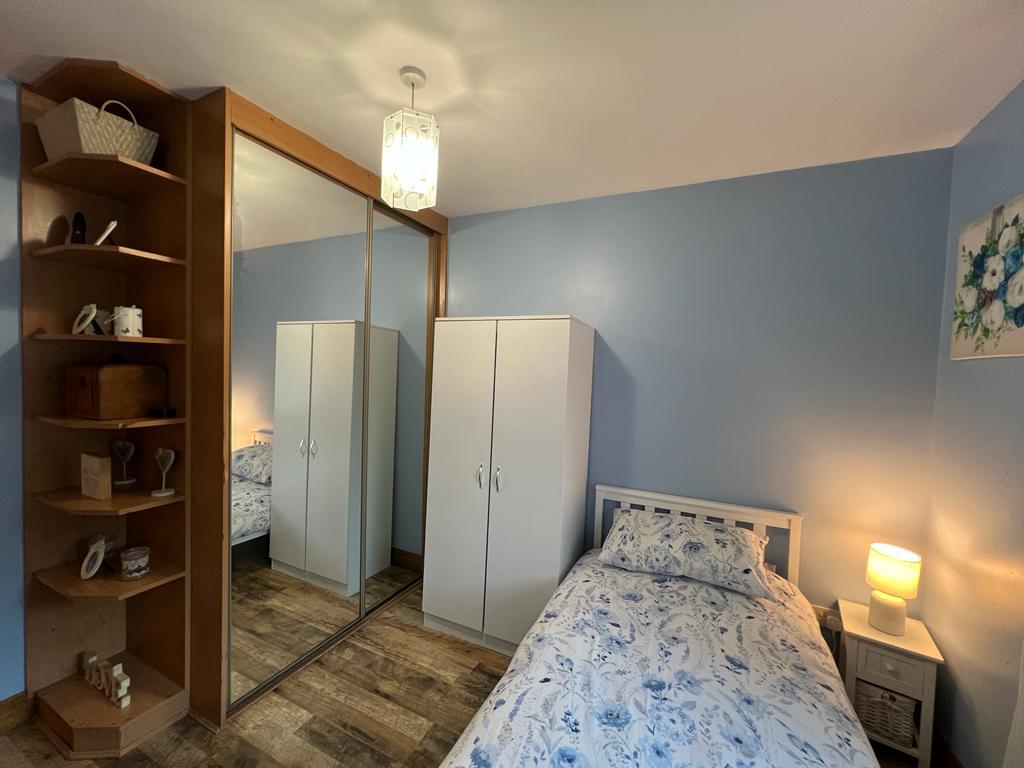 Having built in wardrobes with sliding mirrored doors, laminated wooden floor. Toilet and whb off with recessed lighting.