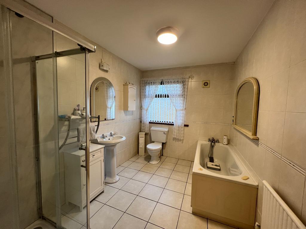 Comprising Jacuzzi style bath, walk in electric shower with PVC cladding to walls, whb and wc, fully tiled walls and floor.