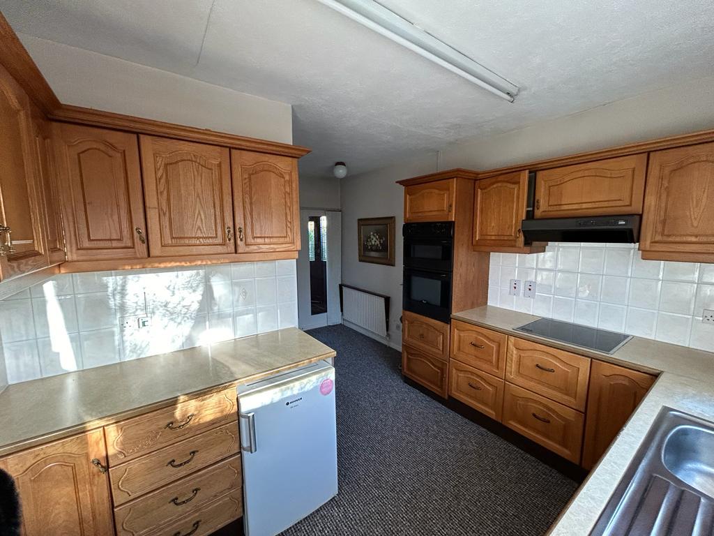 Having eye and low level units, single drainer stainless steel sink unit with mixer taps, hob, double oven, extractor fan, plumbed for washing machine, space for fridge, dining space.