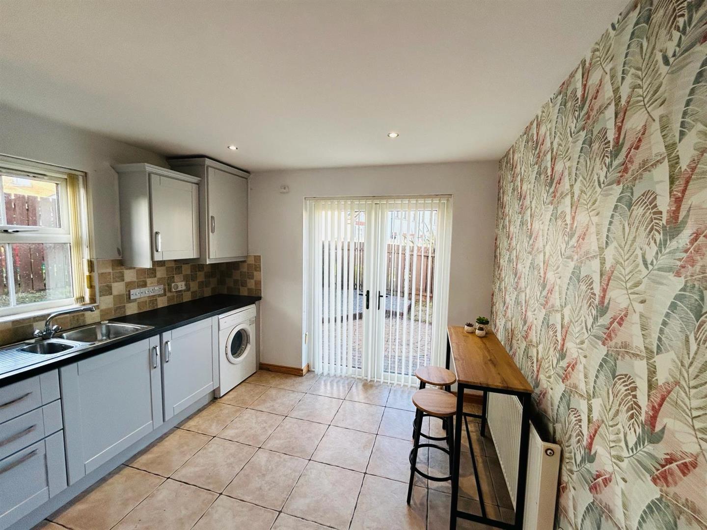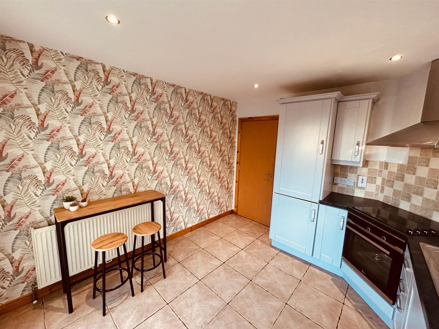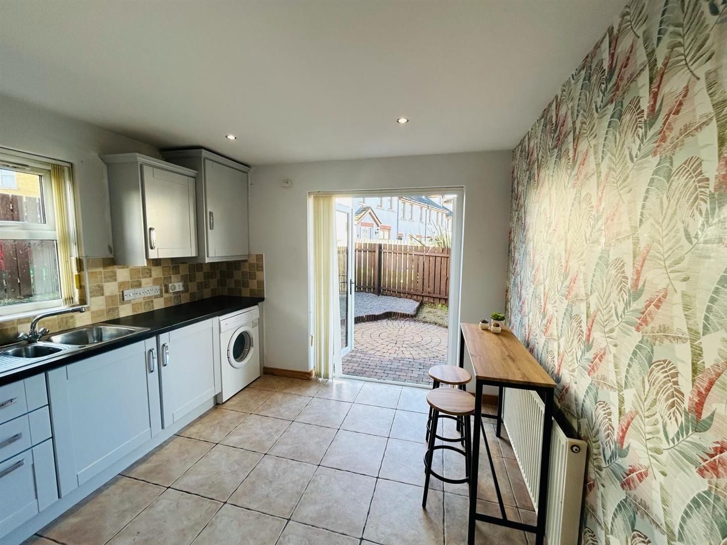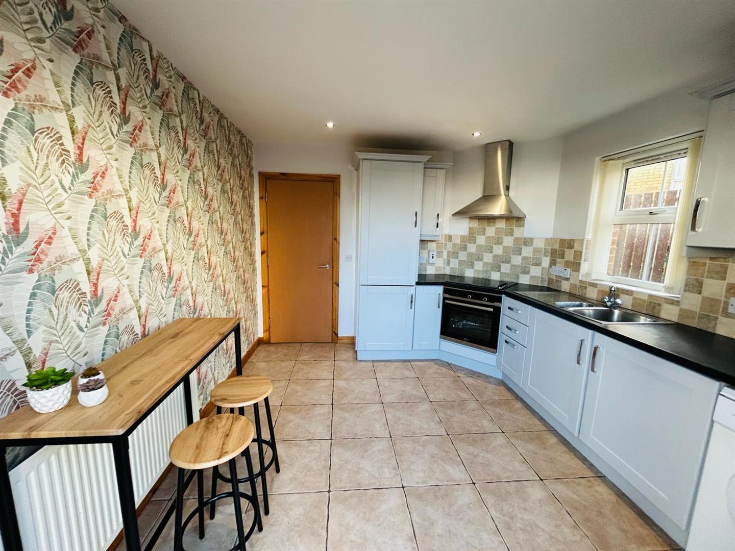 Having eye and low level units, tiling between units, 1 1/2 bowl single drainer stainless steel sink unit with mixer taps, integrated hob and oven, stainless steel extractor hood, space for fridge / freezer, plumbed for washing machine, tiled floor, French doors leading to rear.