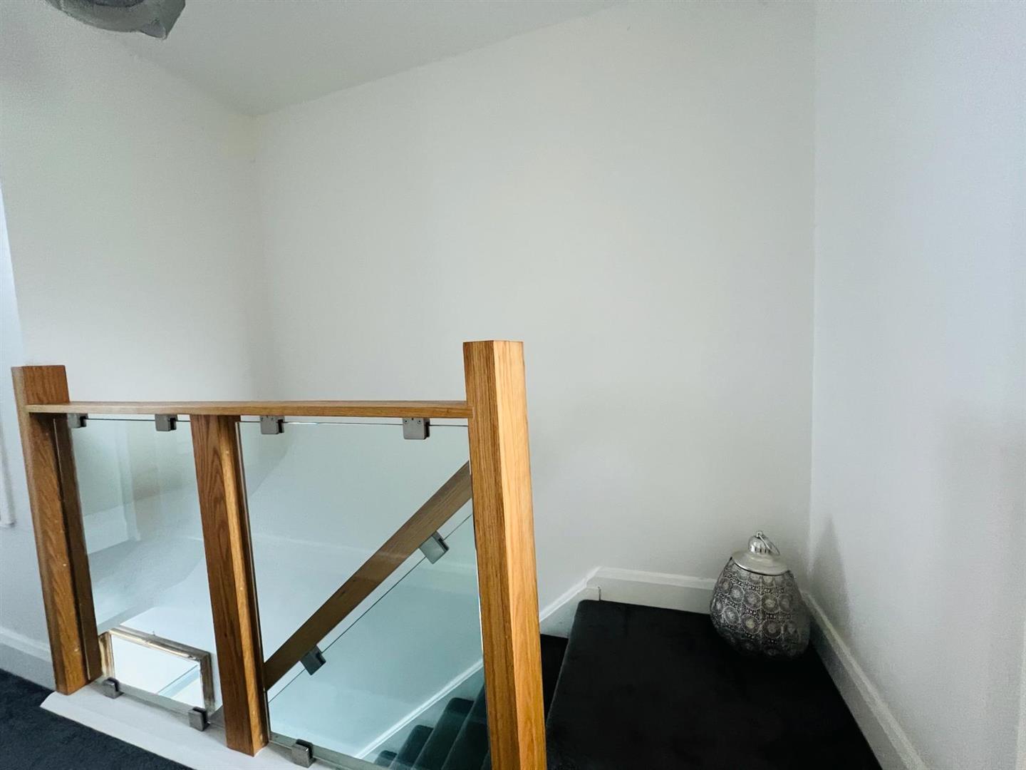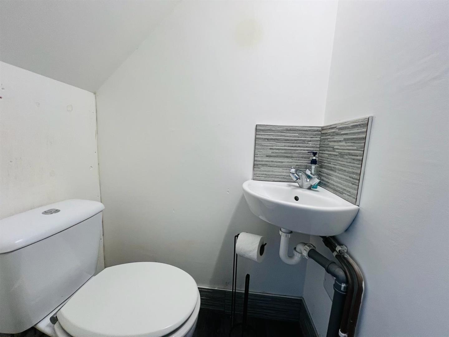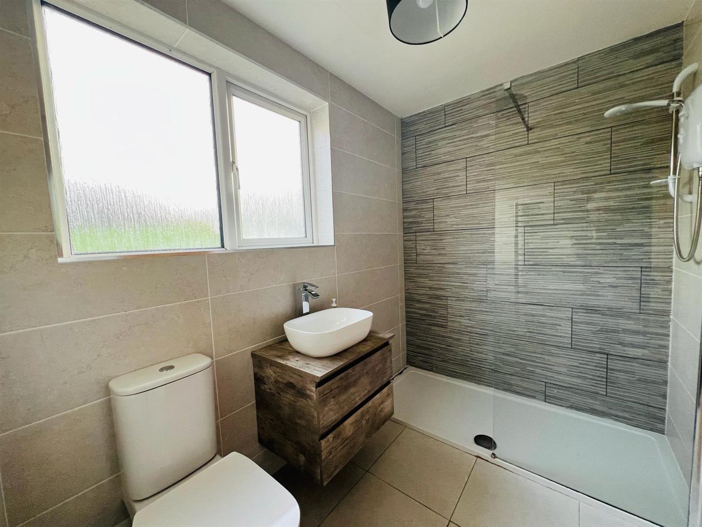 Comprising walk in electric shower, whb set in vanity unit, wc, chrome radiator, mirror with Bluetooth, fully tiled walls and floor.