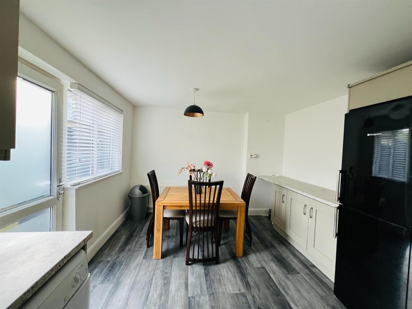 Having range of eye and low level units, tiling between units, 1 1/2 bowl stainless steel sink unit with mixer taps, gas hob, electric underoven, Hotpoint washing machine and tumble dryer, Hotpoint fridge / freezer, ample dining space, laminated wooden floor.