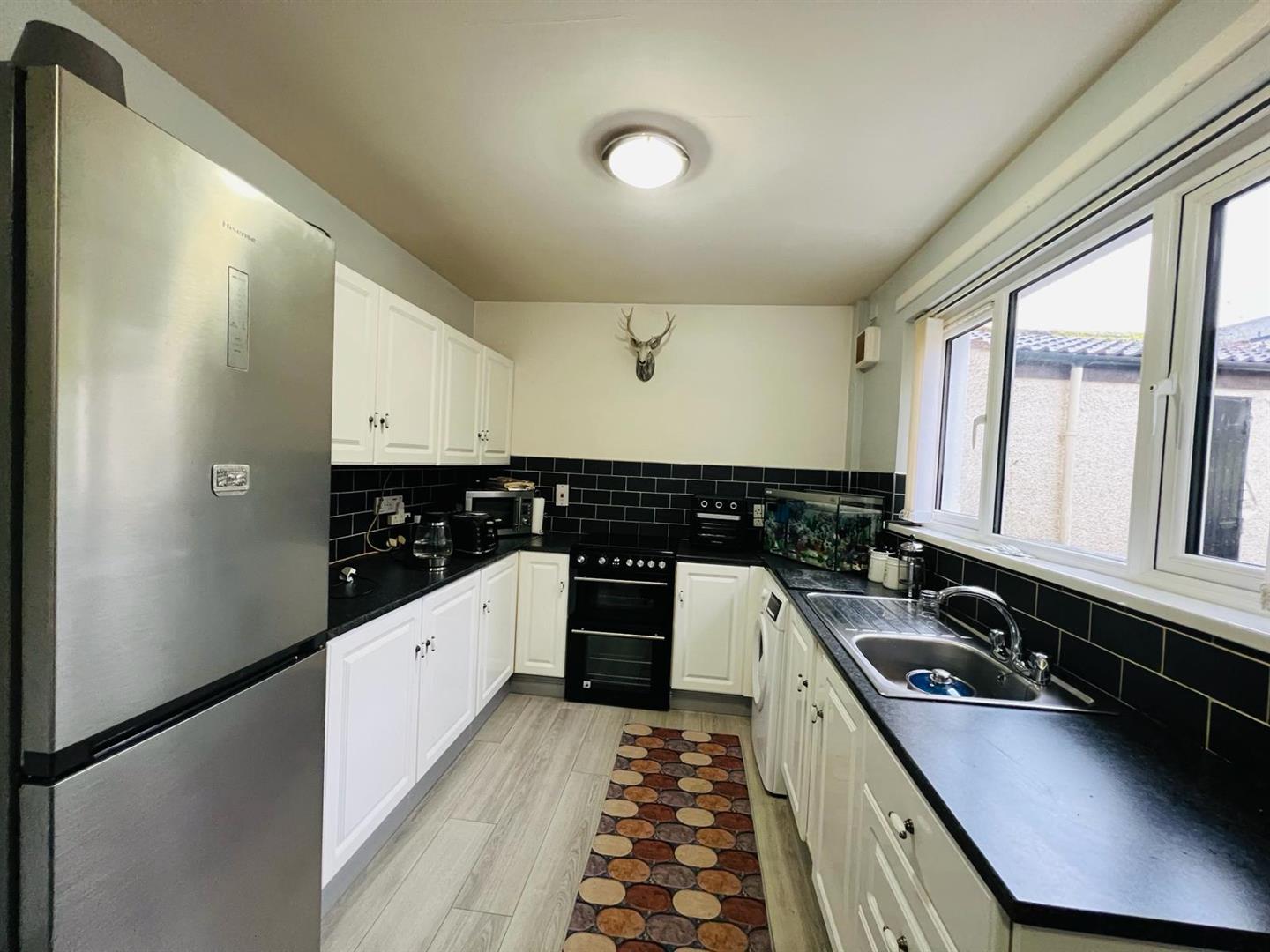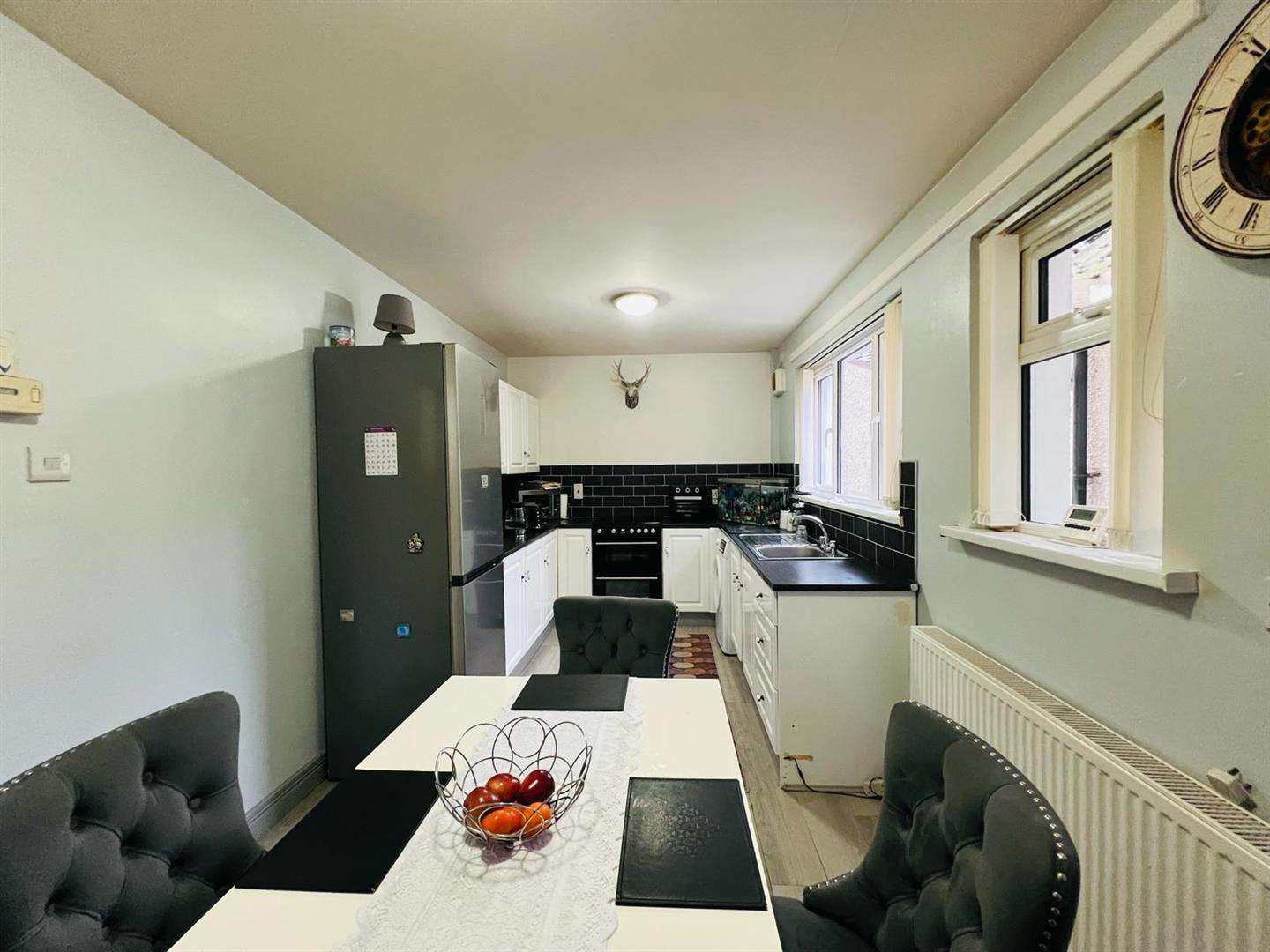 Having eye and low level units, tiling between units, single drainer stainless steel sink unit with mixer taps, wired for cooker, plumbed for washing machine, space for fridge / freezer, dining space, understairs storage, laminated wooden floor.