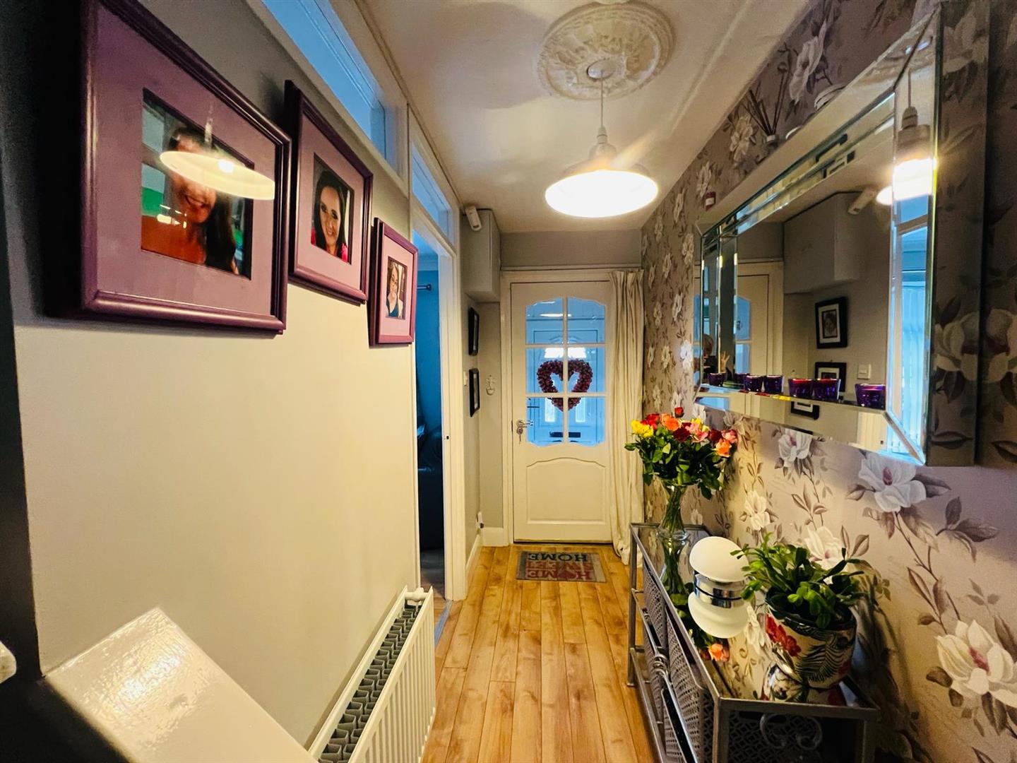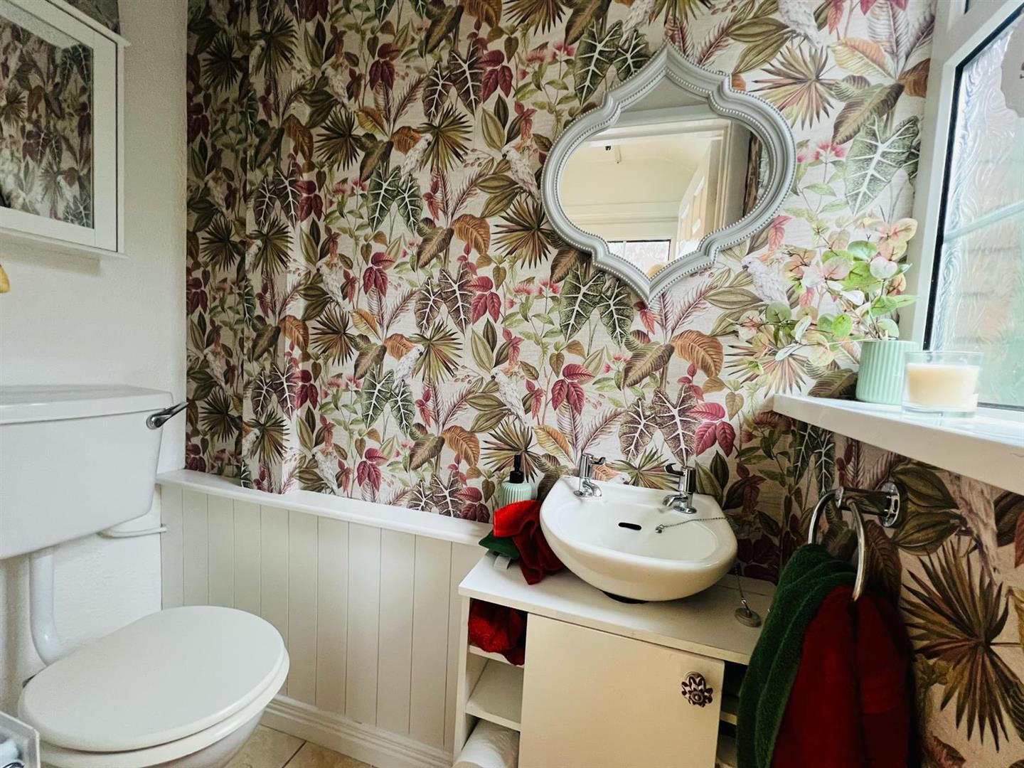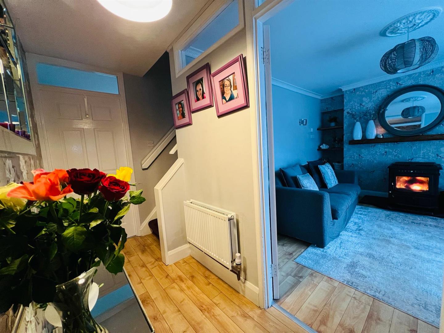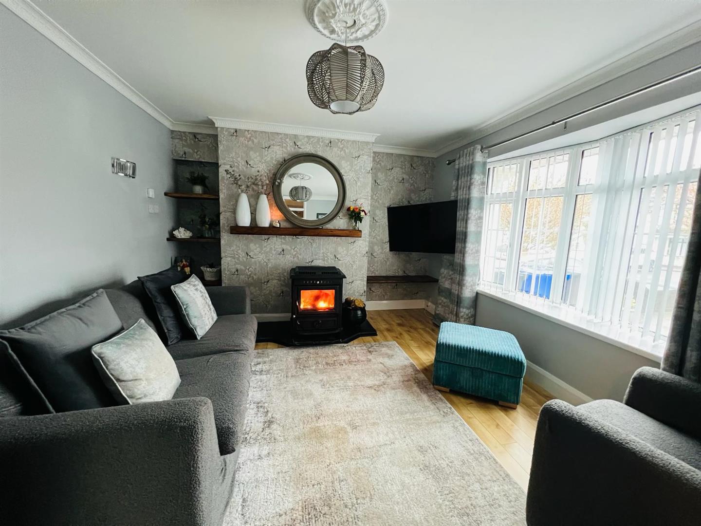 Having multi fuel stove with tiled hearth, ceiling cornicing and centre rose, wall light points, laminated wooden floor.