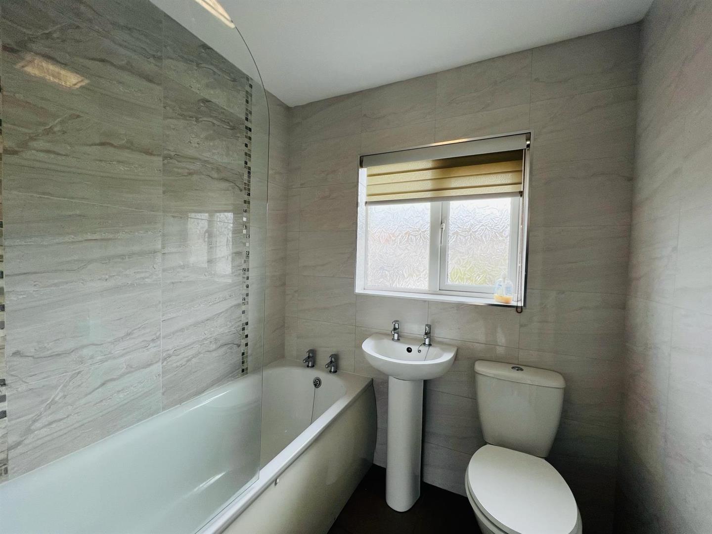 Comprising bath with electric shower over, whb and wc, fully tiled walls and floor.