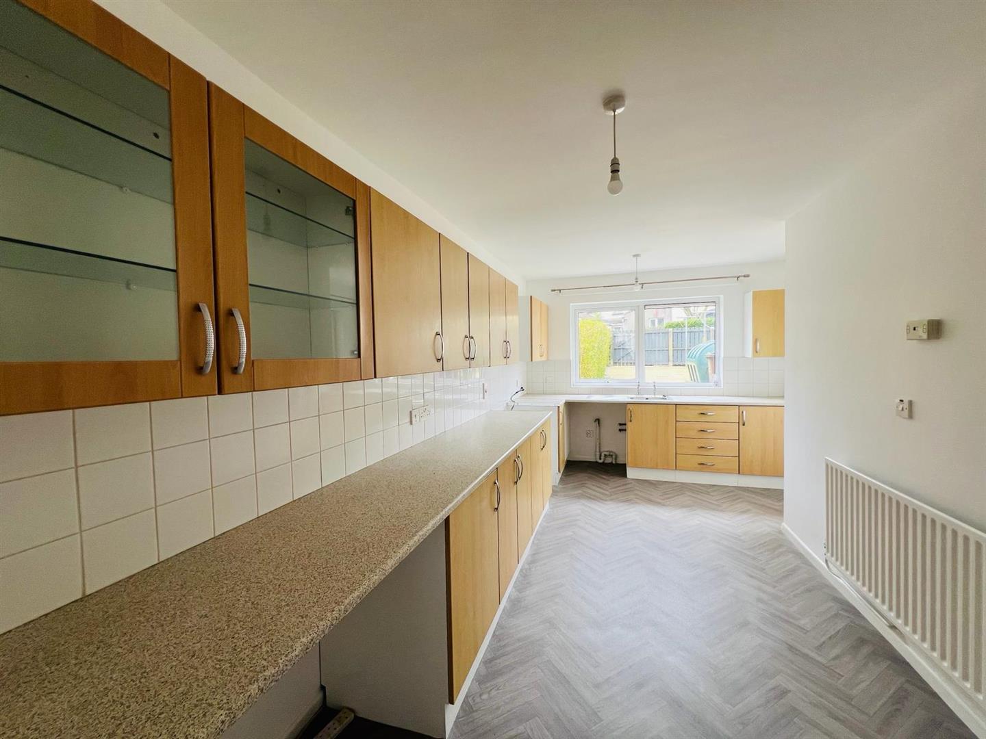 Having range of eye and low level units, tiling between units, single drainer stainless steel sink unit, plumbed for washing machine, space for cooker.
