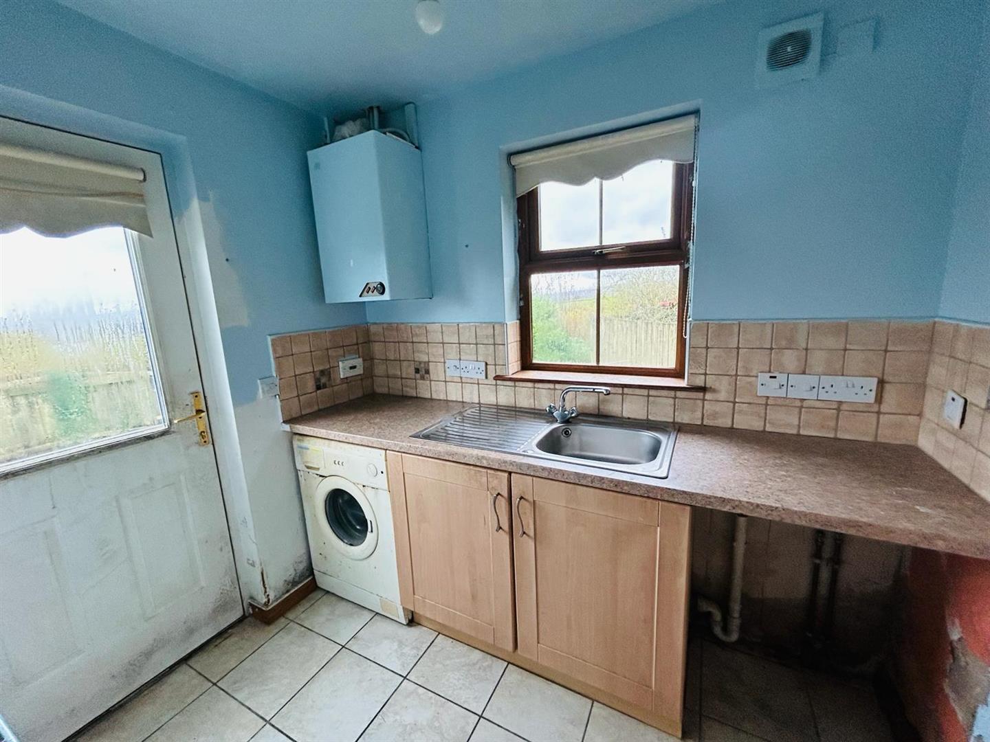 Having low level units, tiling between units, single drainer stainless steel sink unit with mixer taps, plumbed for washing machine, space for tumble dryer, extractor fan, tiled floor.