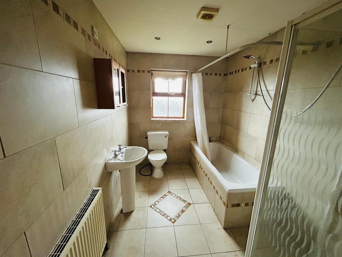 Comprising fully tiled walk in shower, whb and wc, extractor fan, recessed lighting, fully tiled walls, tiled floor.