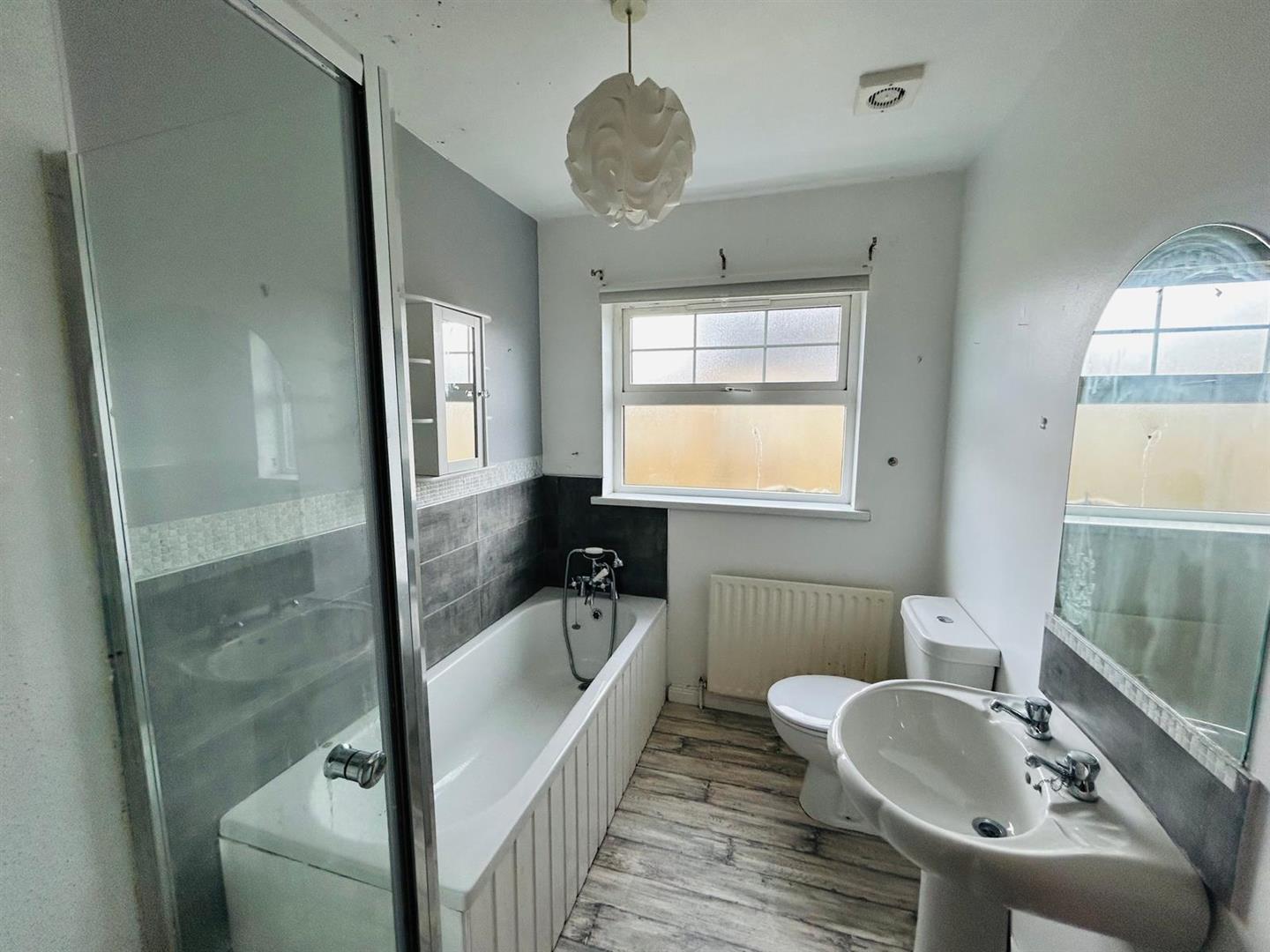 Comprising bath with telephone hand shower attachment to taps, walk in electric shower, whb and wc.