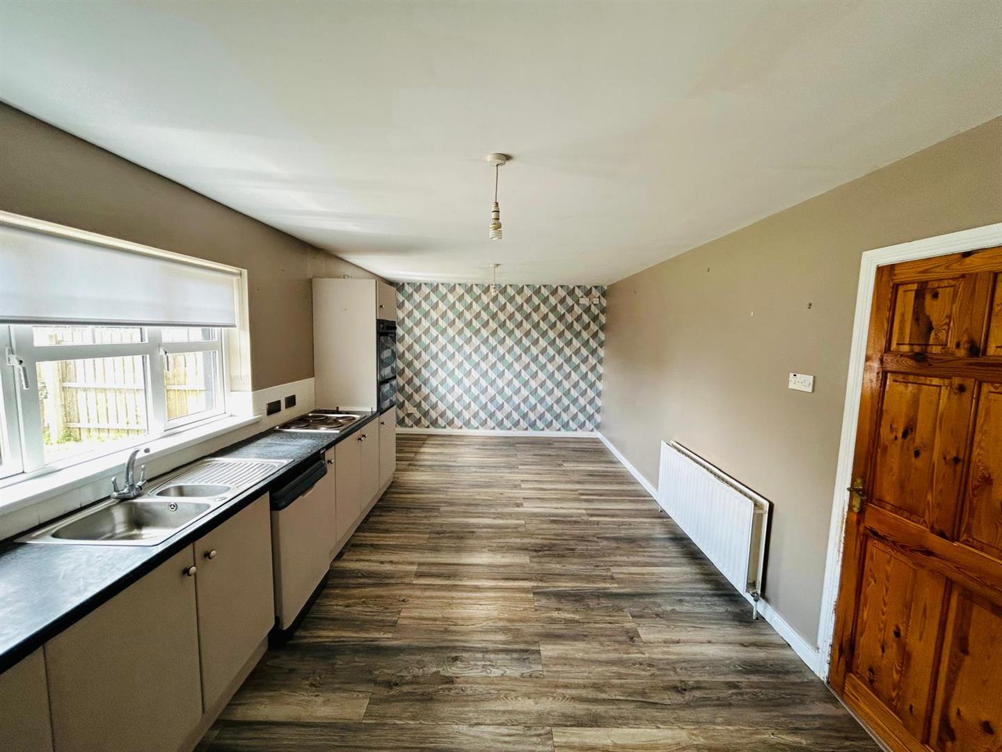 Having range of units, tiling between units, single drainer stainless steel sink unit with mixer taps, hob, double oven, plumbed for dishwasher, dining space, laminated wooden floor.