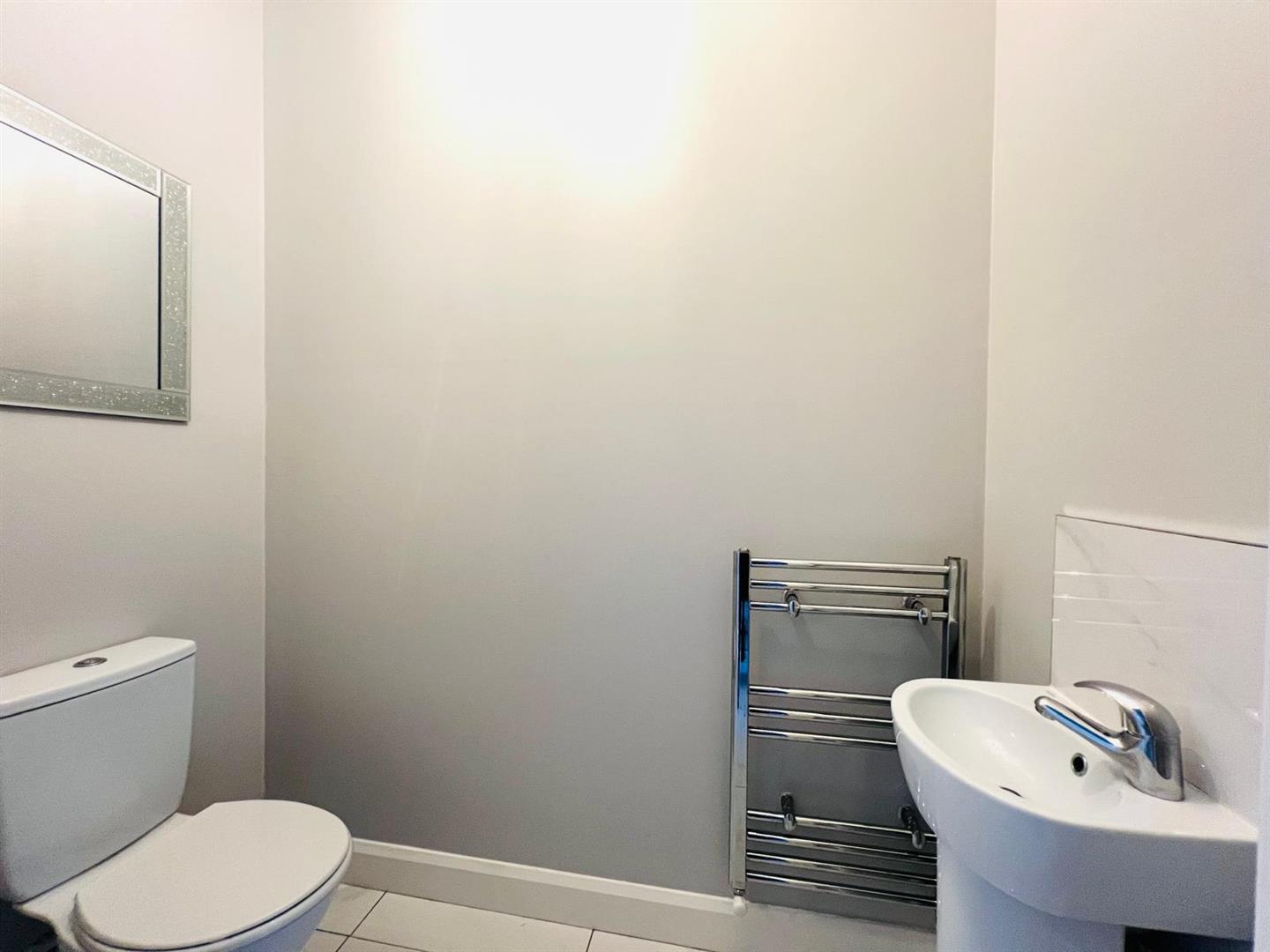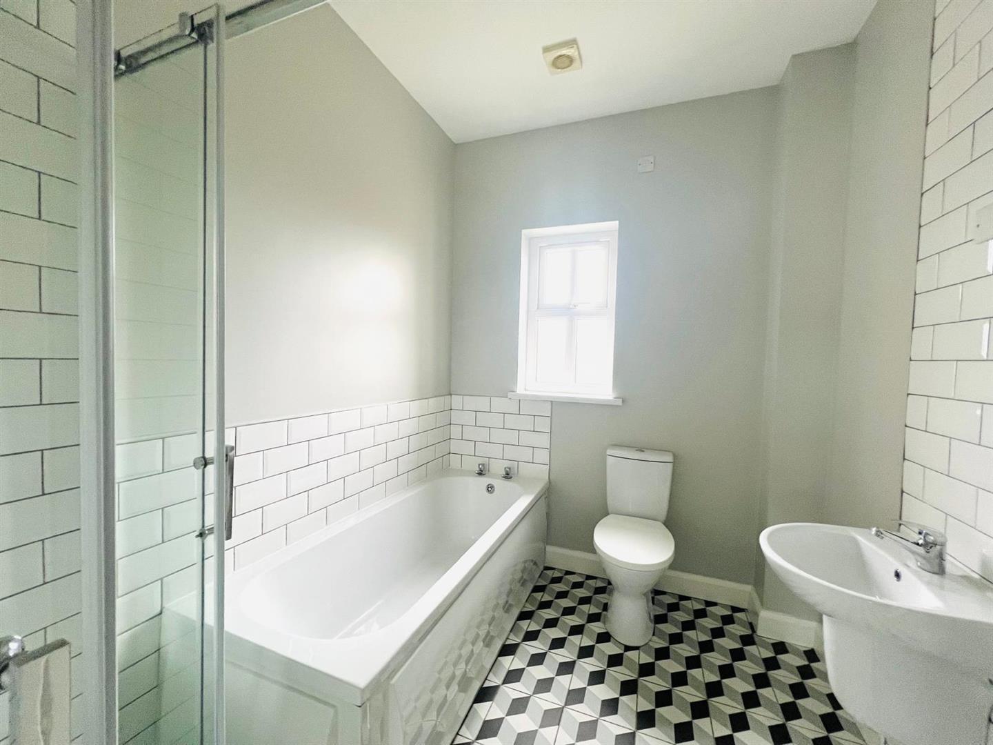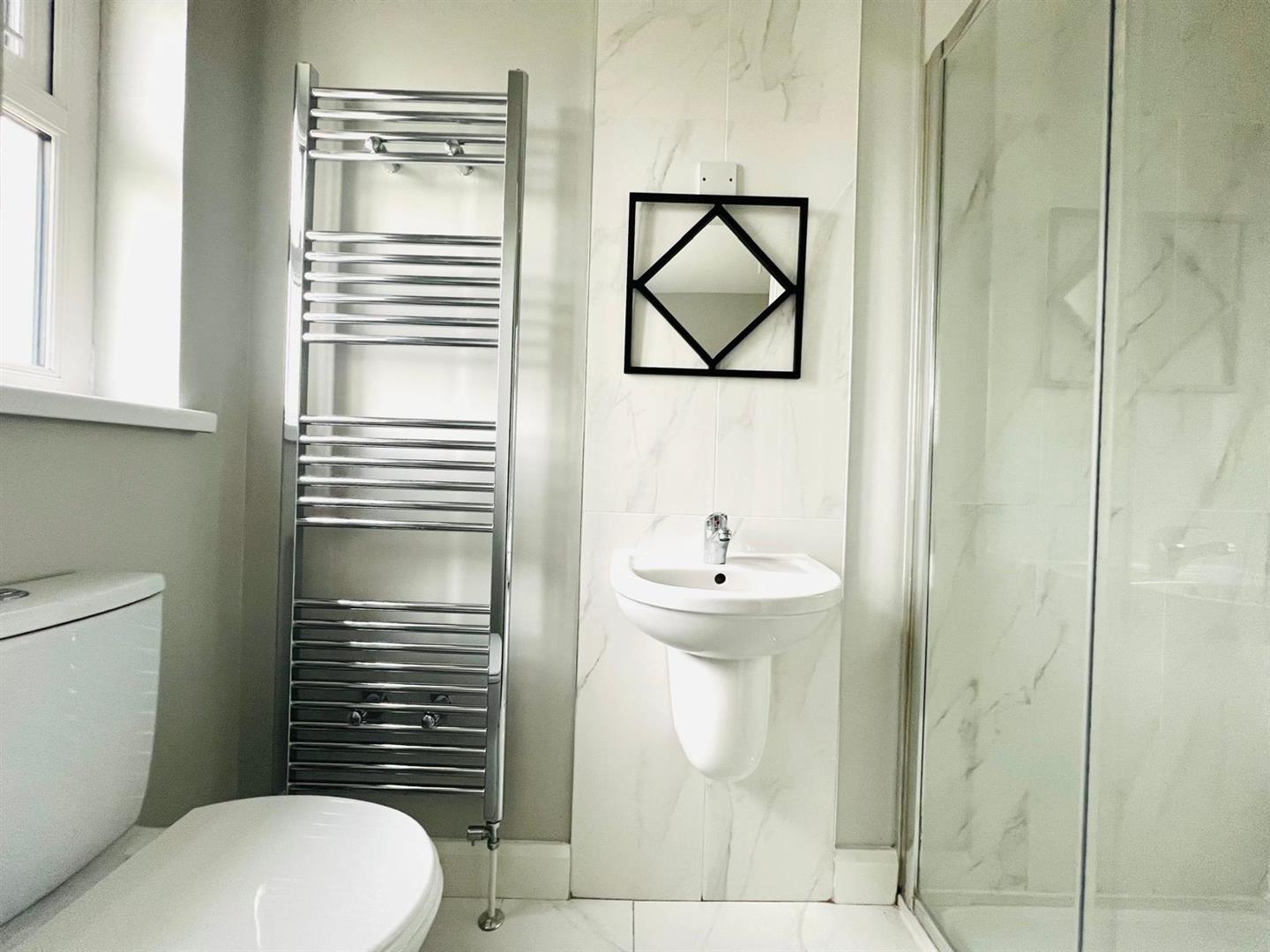 Having whb with tiling around, wc, chrome heated towel rail, extractor fan, tiled floor.