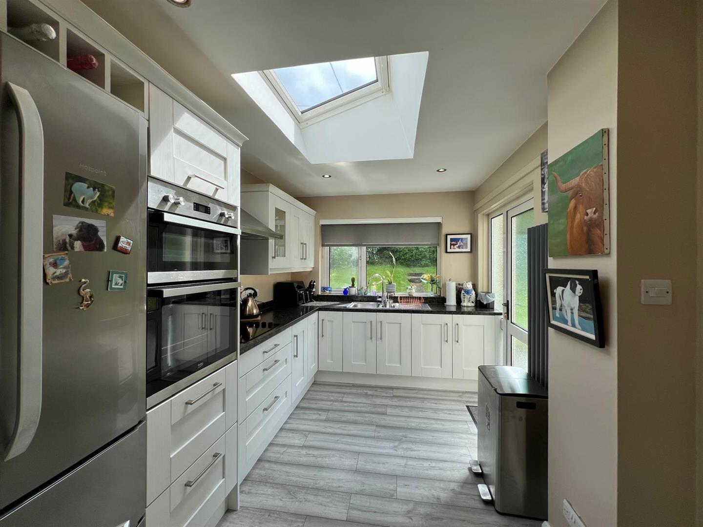 Having eye and low level units with concealed lighting under, glazed dsiplay cupboards, 1 1/2 bowl single drainer stainless steel sink unit with mixer taps, hob, 'Beko' double oven, stainless steel extractor hood, space for fridge/freezer, recessed lighting, laminate floor.