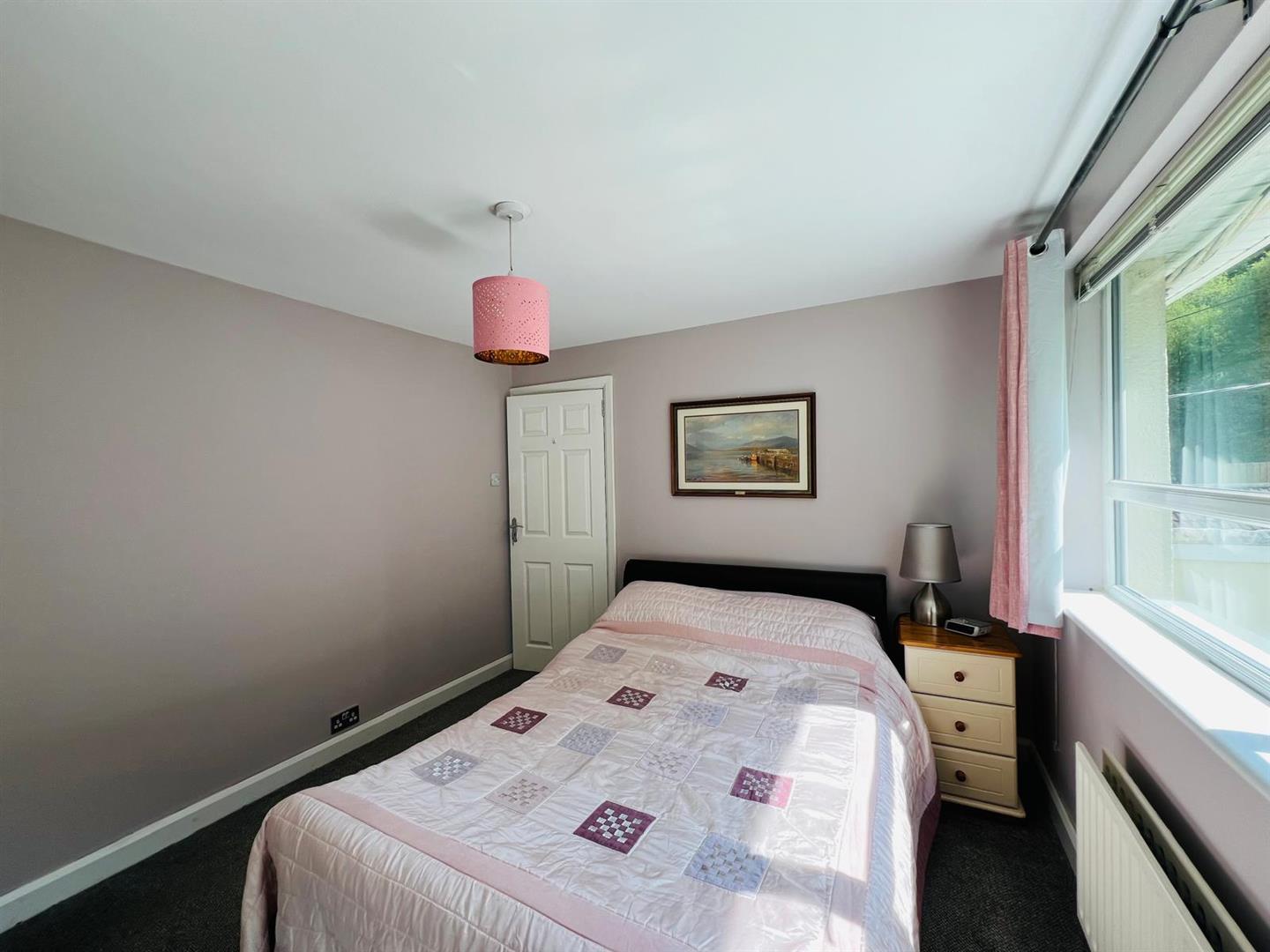 Neat lawn to rear bordered by marure shurbs and trees.