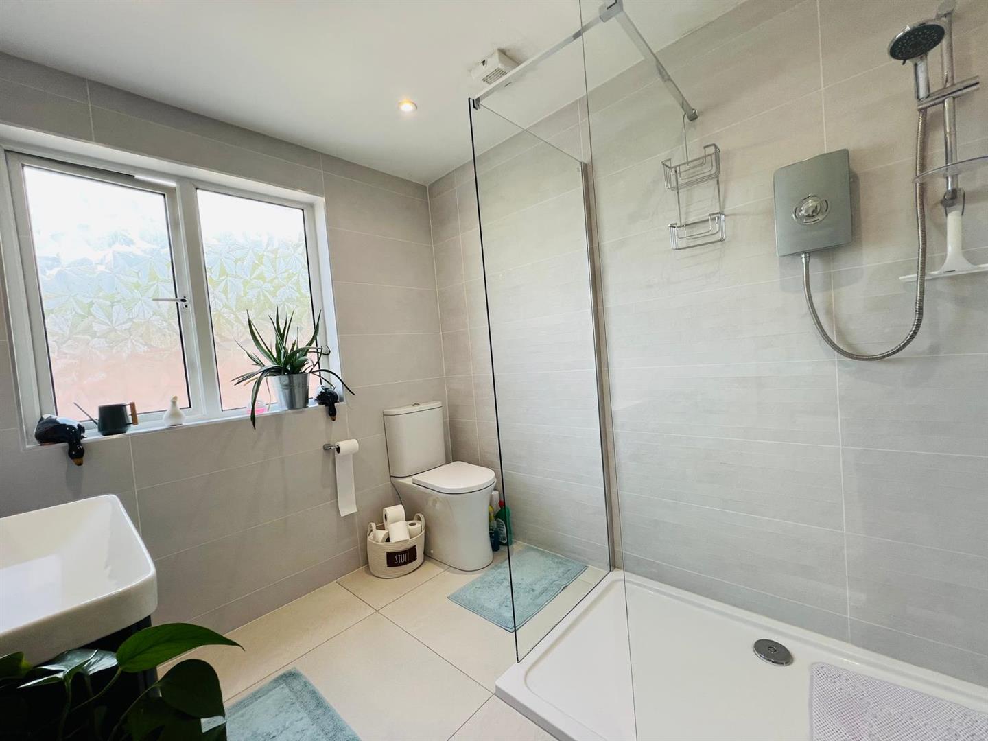 Comprising fully tiled walk in electric shower, whb set in vanity unit, wc, recessed lighting, feature radiator, fully tiled walls, tiled floor.