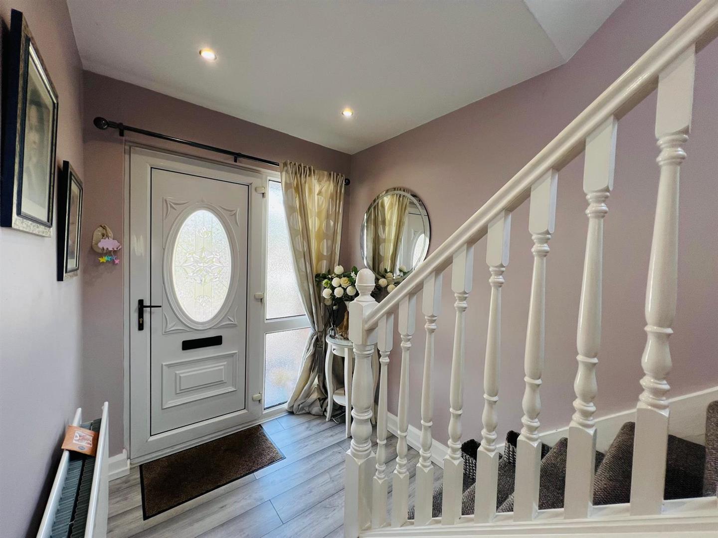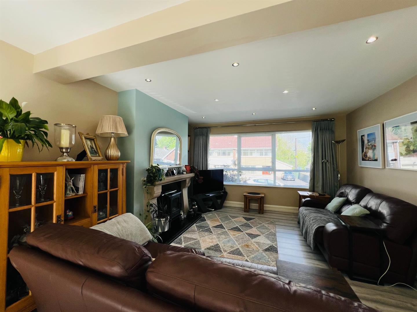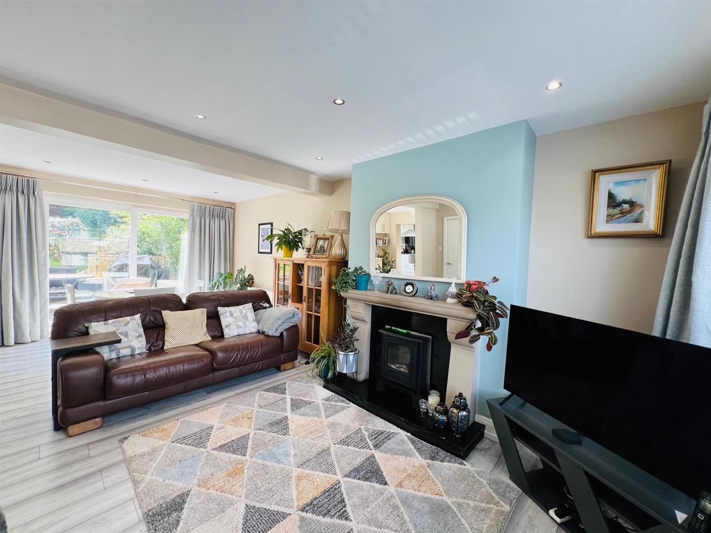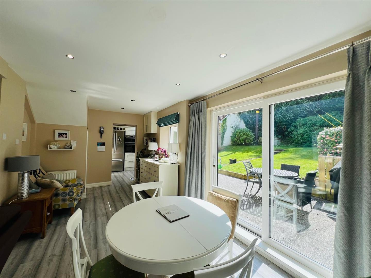 Having attractive fireplace, understairs storage cupboard, recessed lighting, laminated wooden floor, ample dining space with patio doors.