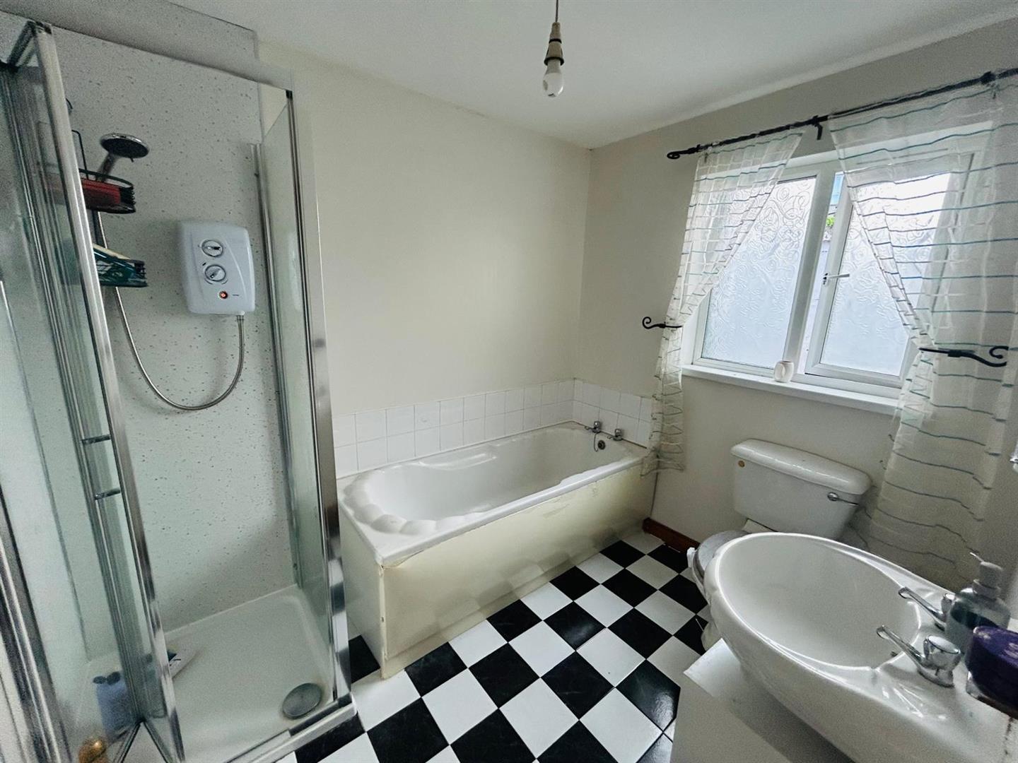 Comprising bath with tiling around, whb with tiling around, wc, walk in electric shower, PVC cladding to walls, tiled floor.