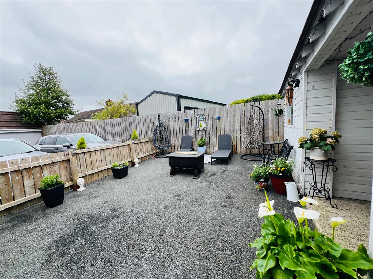 Tarmac driveway and yard to rear enclosed by fence and gate.