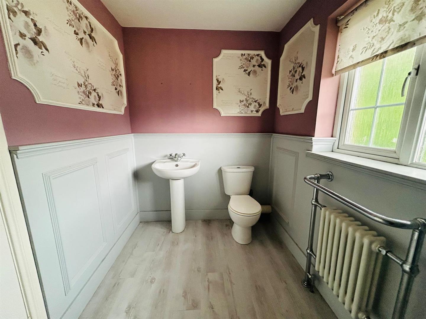 Comprising whb and wc, space for bath, half panelled walls, laminated wooden floor.