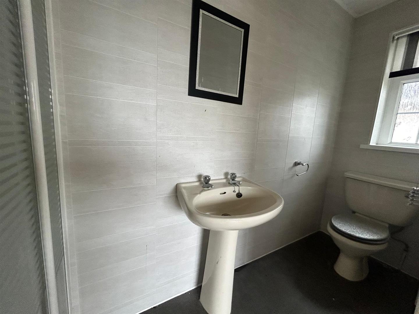 Comprising fully tiled walk in electric shower, whb and wc, fully tiled walls.