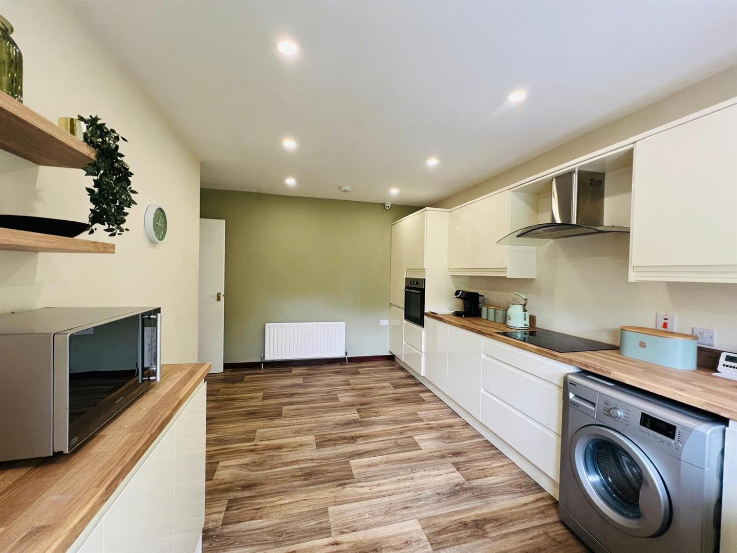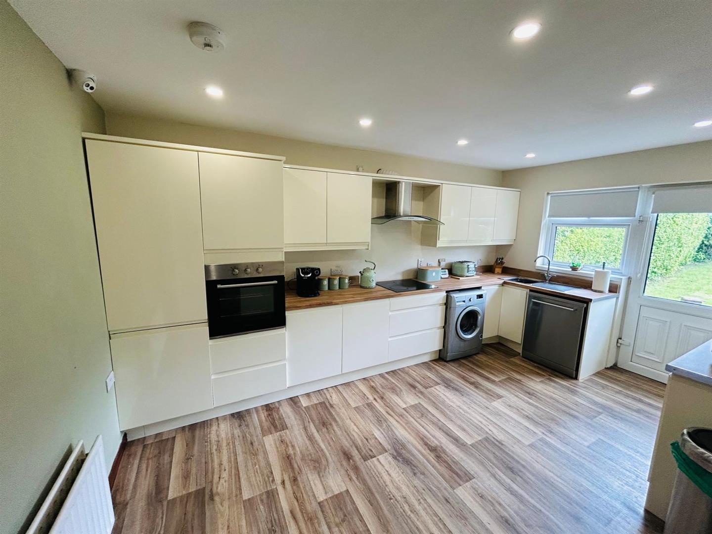 Having range of eye and low level units, single drainer stainless steel sink unit with mixer taps, hob, oven, stainless steel extractor hood, integrated fridge/freezer, plumbed for washing machine and dishwasher, recessed lighting.