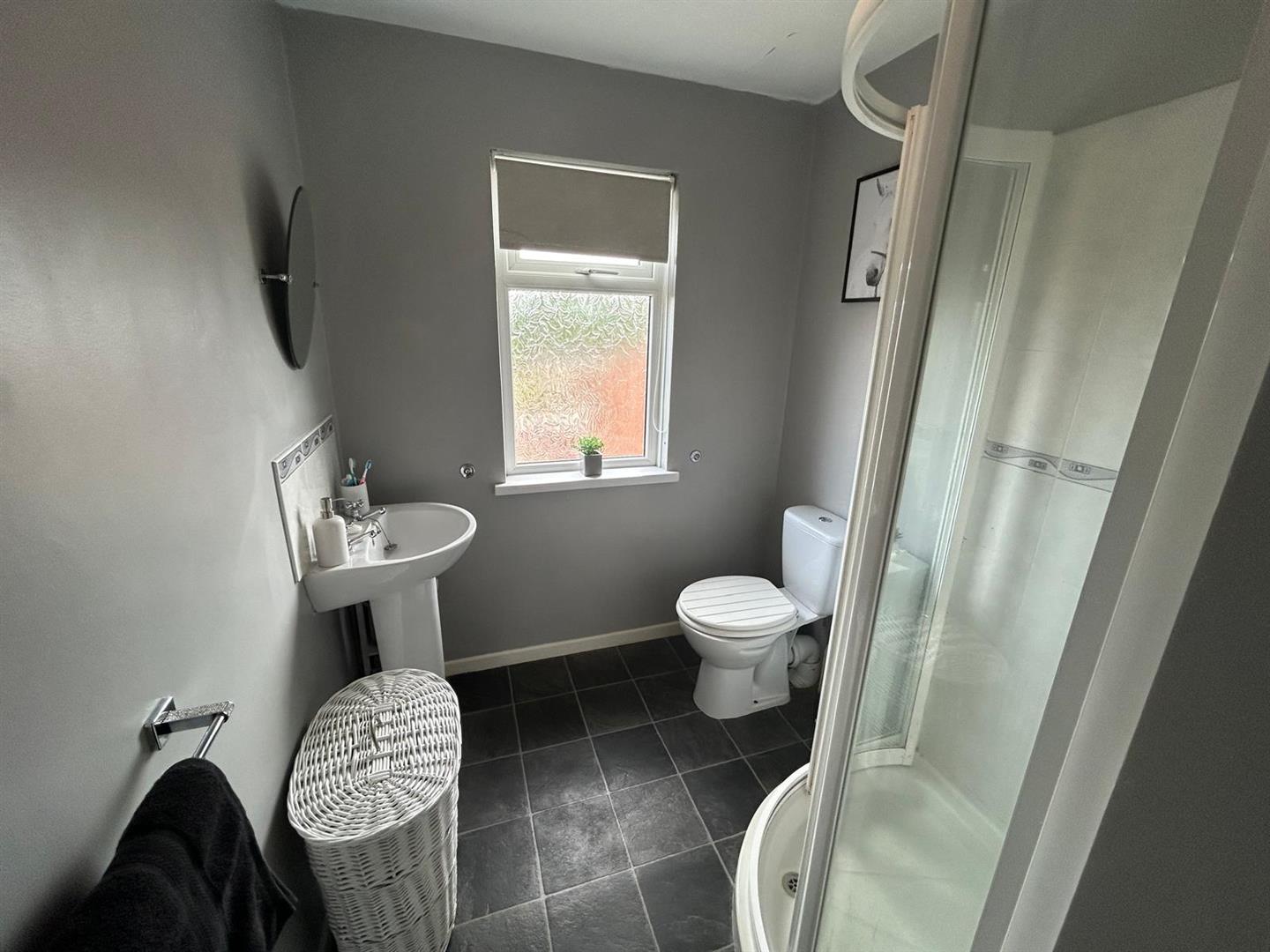 Comprising fully tiled walk in electric shower, whb with tiling around, wc, extractor fan, hotpress.