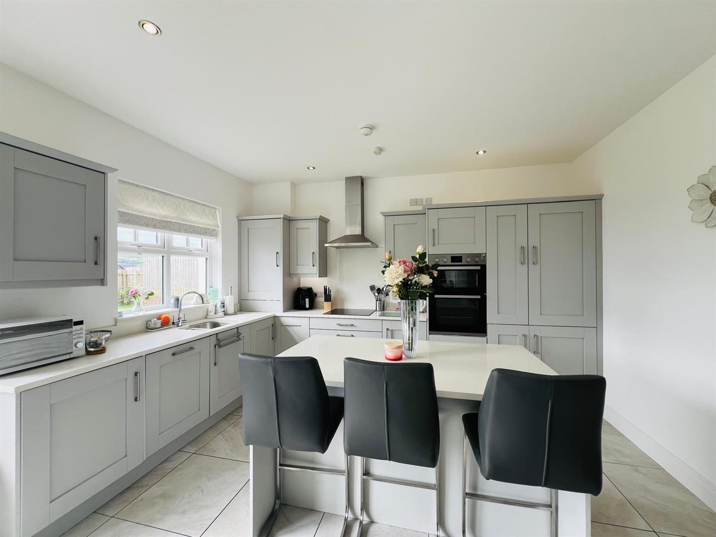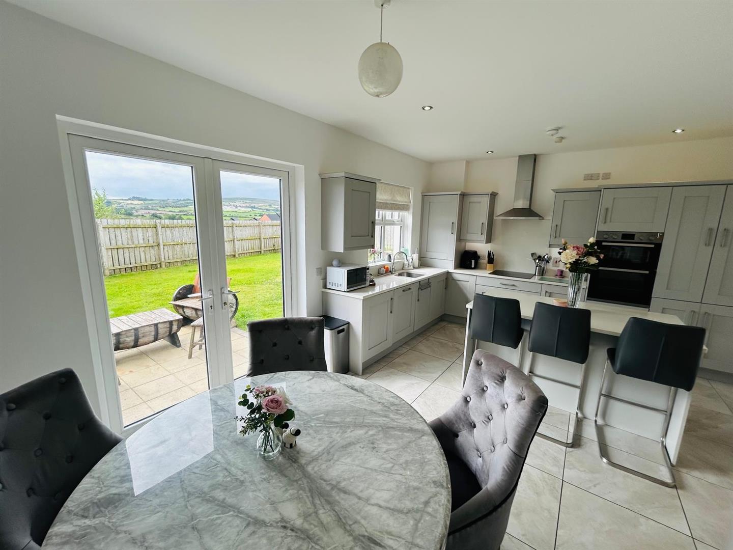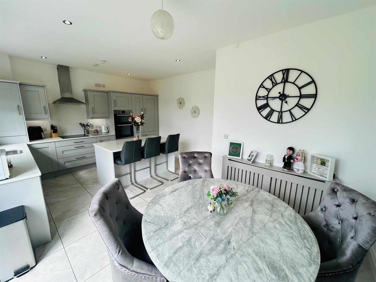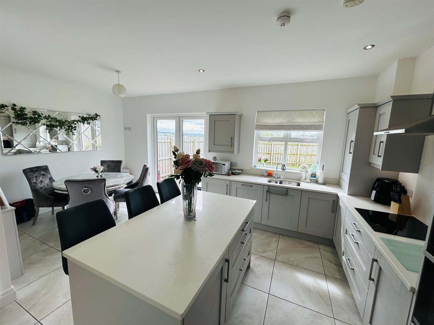 Having excellent range of eye and low level units, stainless steel sink unit with mixer taps set in Quartz worktop, centre island with storage under, breakfast bar, hob, double oven, stainless steel extractor hood, integrated fridge / freezer and dishwasher, recessed lighting, dining space with French doors, tiled floor.