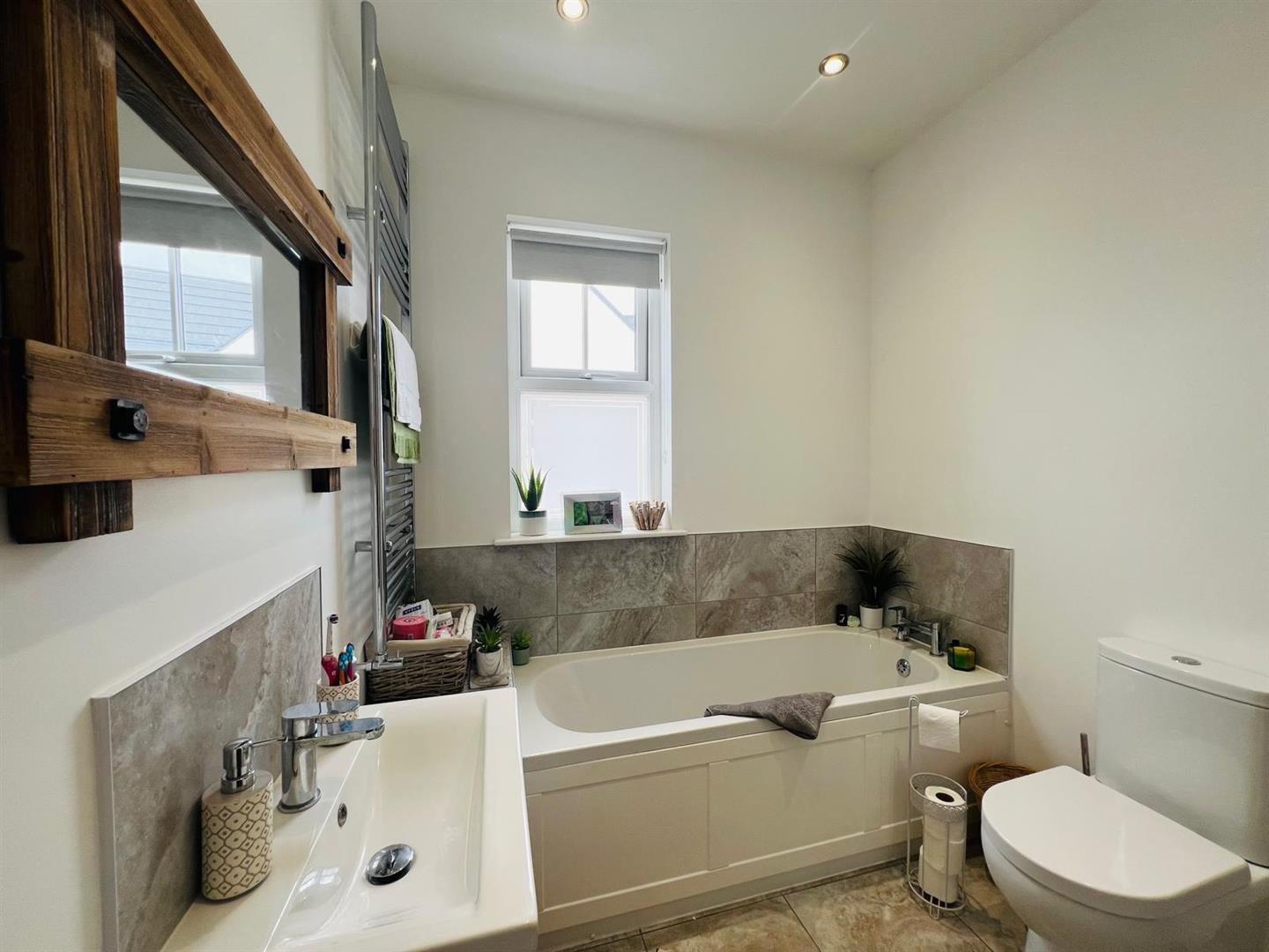 Comprising bath, tiled walk in shower, whb set in vanity unit, wc, recessed lighting, tiled floor.