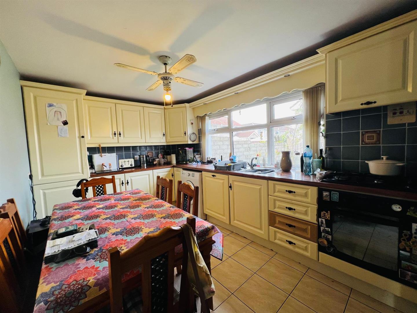 Having eye and low level units, tiling between units, single drainer stainless steel sink unit with mixer taps, gas hob, electric underoven, integrated fridge / freezer, plumbed for washing machine, dining space, tiled floor.
