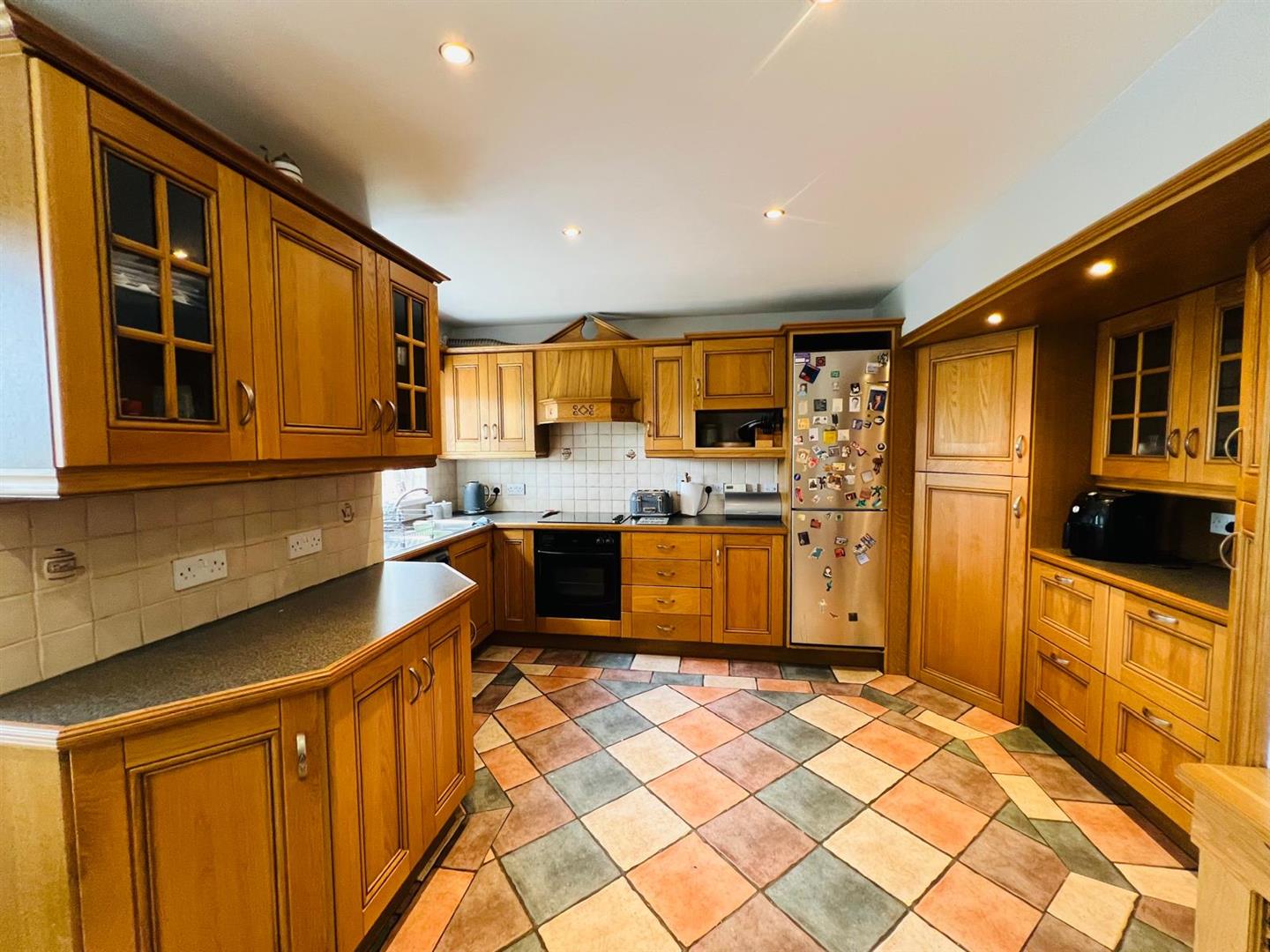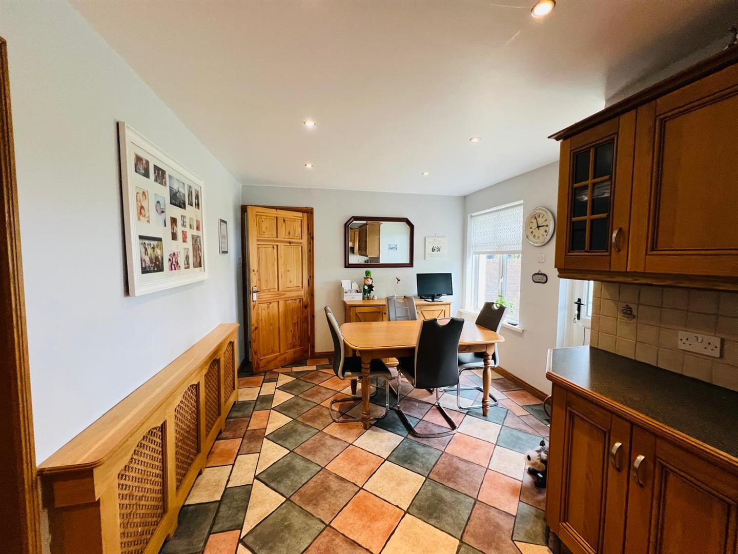 Having range of eye and low level units, tiling between units, 1 1/2 bowl stainless steel sink unit with mixer taps, hob, underoven, extractor hood, plumbed for washing machine, space for fridge / freezer, ample dining space, recessed lighting, tiled floor.