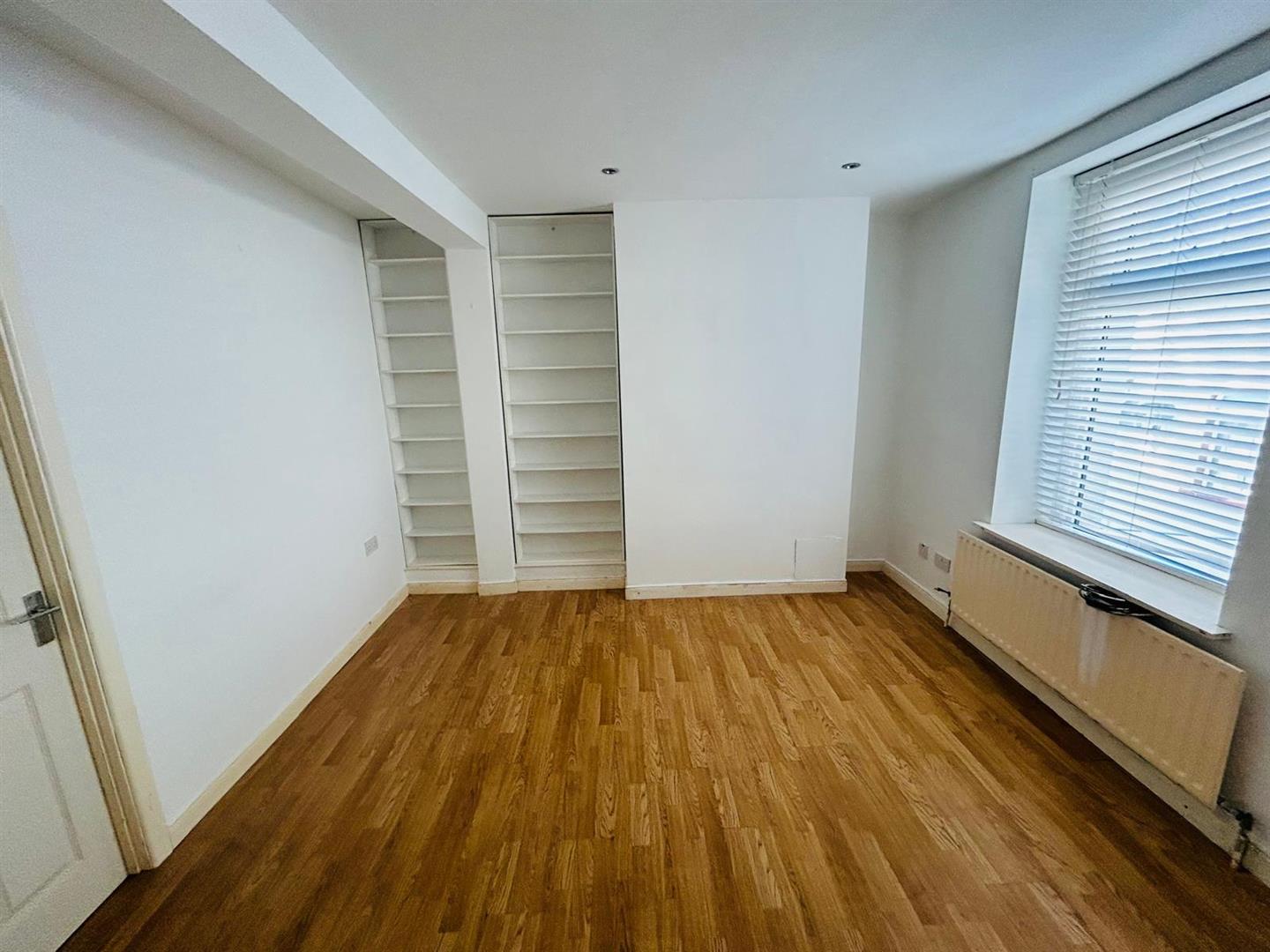 Having recessed lighting, shelving, laminated wooden floor.