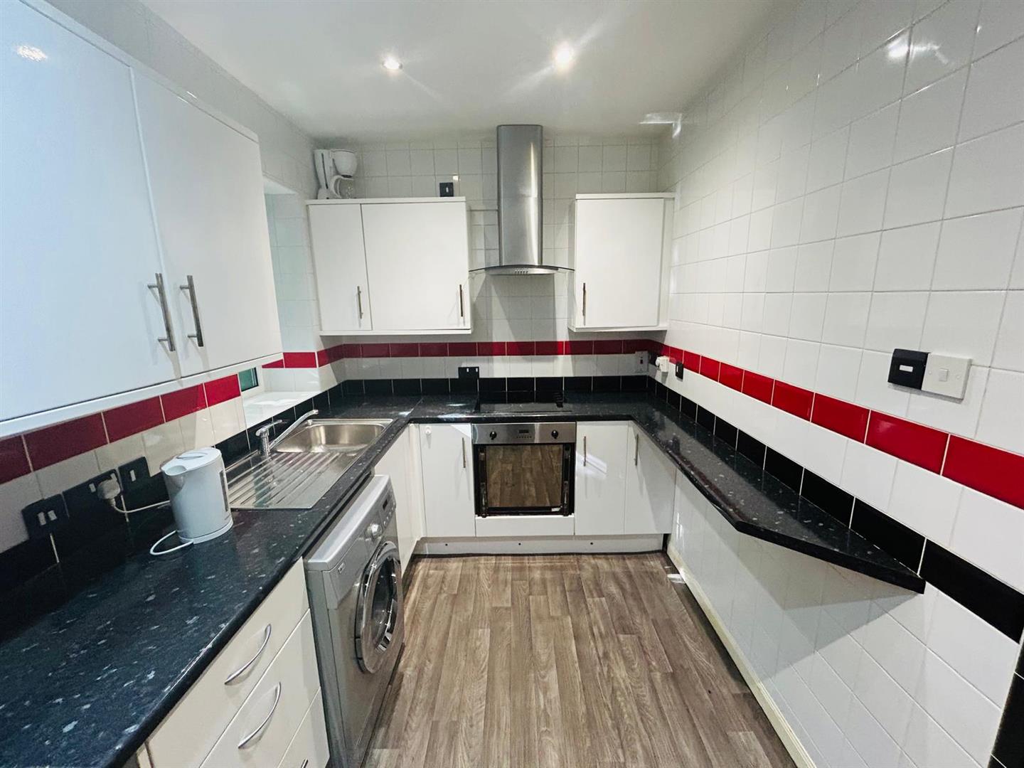 Having eye and low level units, tiling between units, single drainer stainless steel sink unit with mixer taps, hob, underoven, stainless steel extractor hood, recessed lighting.