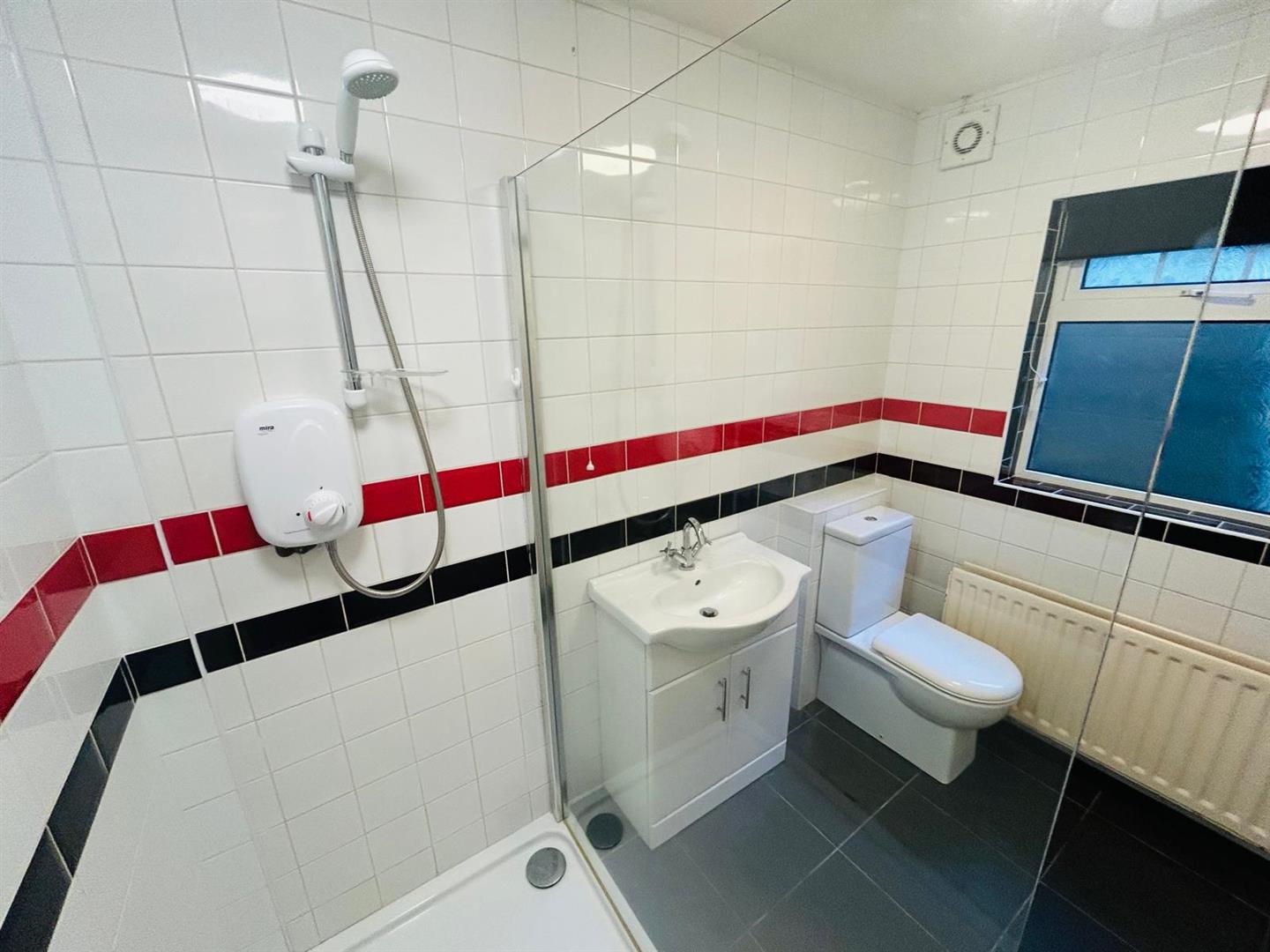 Comprising walk in electric shower, whb vanity unit, fully tiled walls, tiled floor.