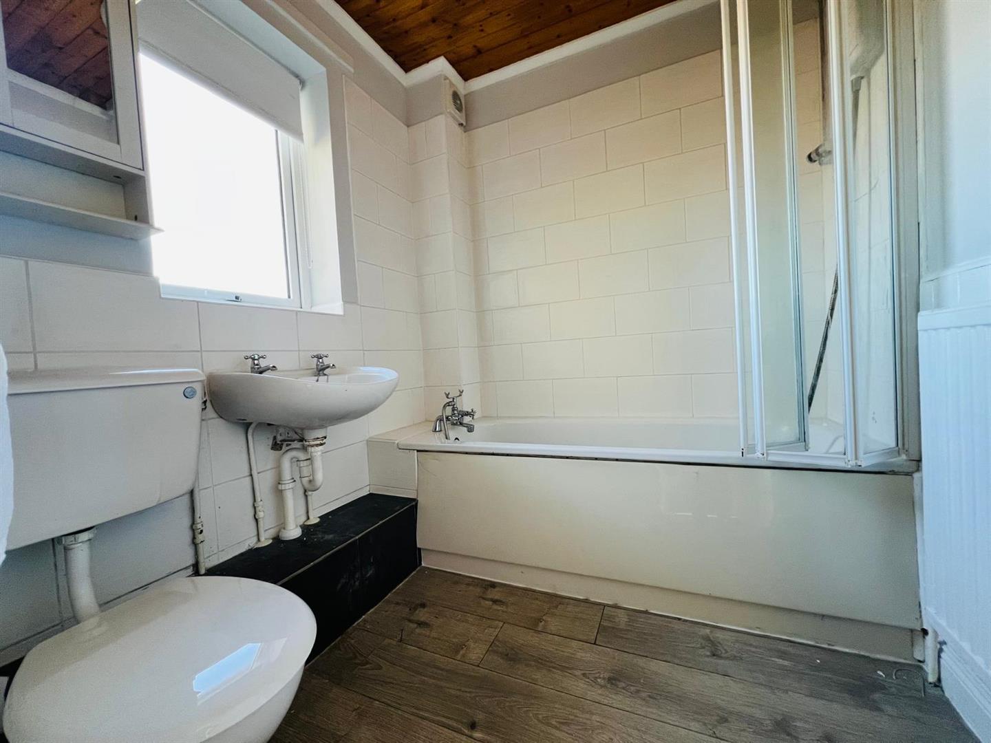 Comprising bath with shower over, shower screen, whb and wc, wooden ceiling, laminated wooden floor.