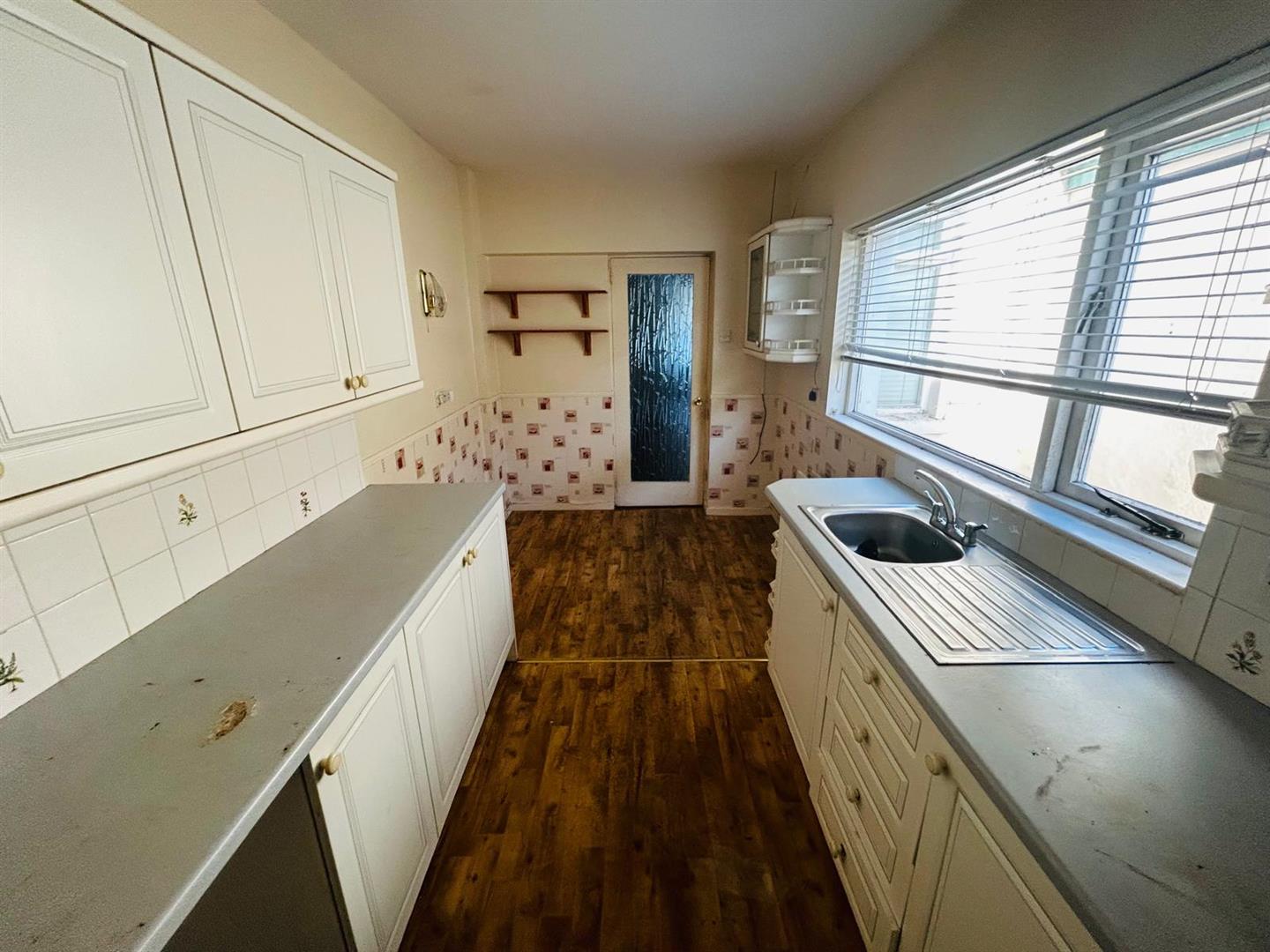 Having eye and low level units, tiling between units, single drainer stainless steel sink unit with mixer taps, wired for cooker, space for fridge.