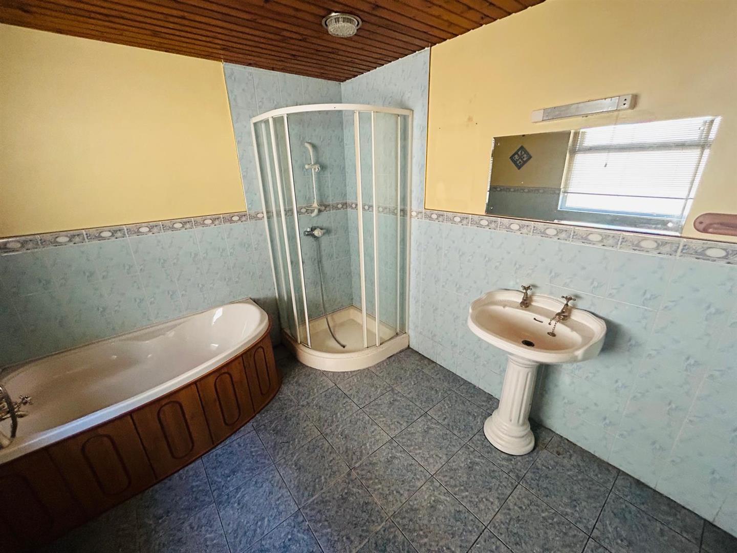 Comprising corner bath with handles and shower over, whb and wc, fully tiled walk in shower, wooden ceiling, partly tiled walls, tiled floor.