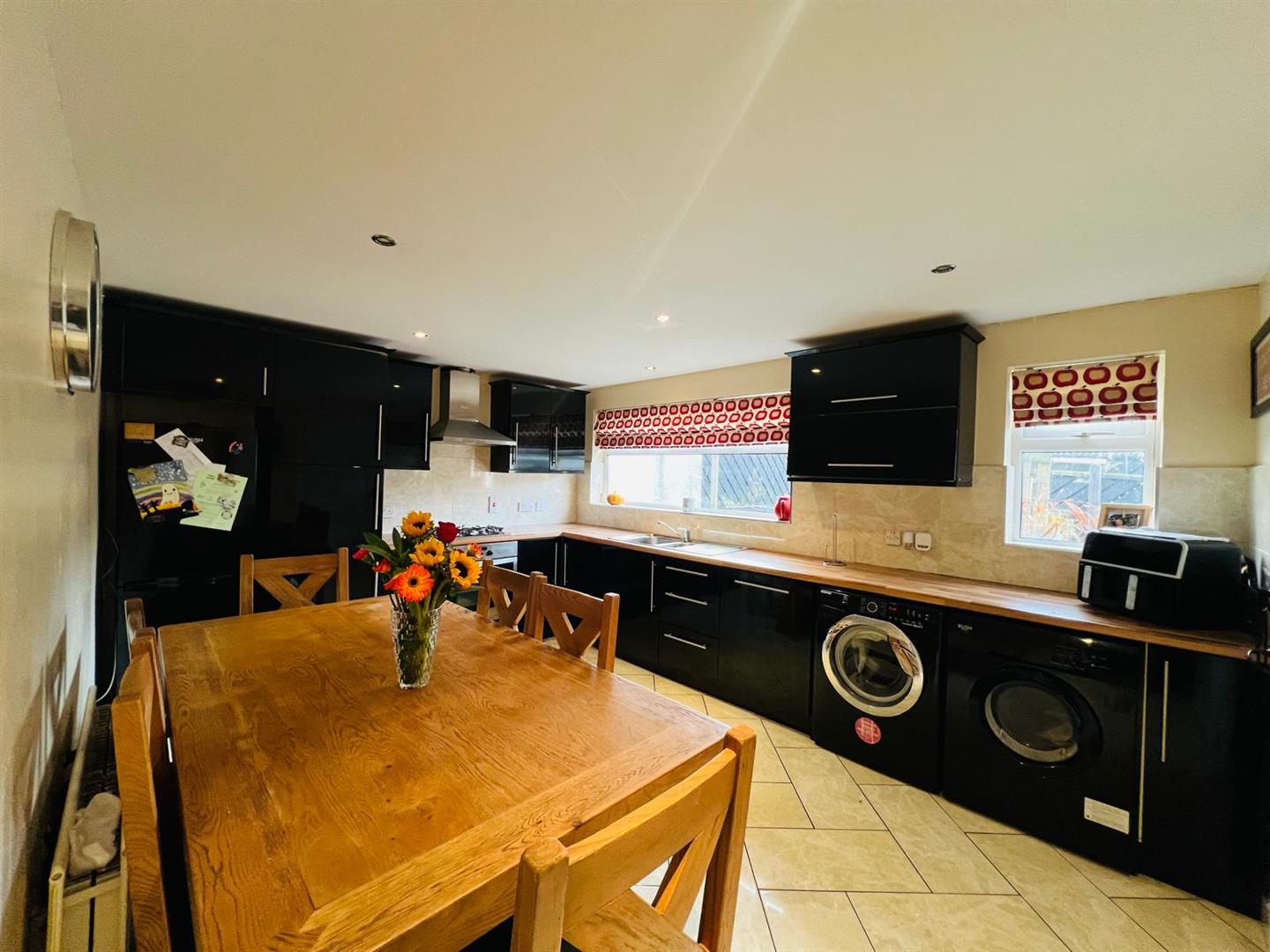 Having range of eye and low level units, tiling between units, 1 1/2 bowl stainless steel sink unit with mixer taps, gas hob, electric underoven, space for fridge / freezer, integrated dishwasher, space for tumble dryer and washing machine, recessed lighting, ample dining space, tiled floor.
