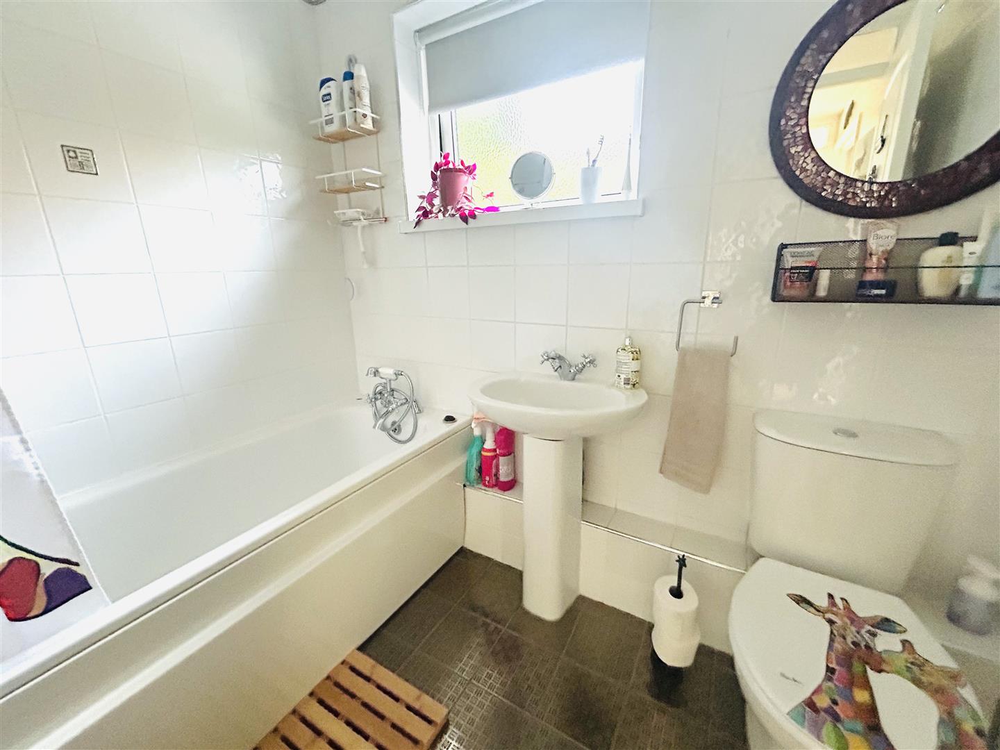 Comprising bath with electric shower over, whb and wc, fully tiled walls and floor.